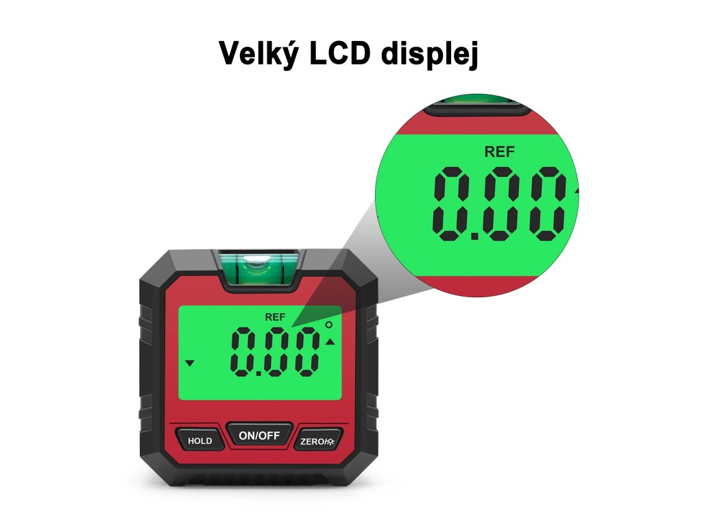 - Digitální úhloměr je vybaven LCD displejem s podsvícením, takže měření lze snadno přečíst i za zhoršených světelných podmínek. Díky tomu můžete pokračovat v práci bez přerušení bez ohledu na světelné podmínky.
