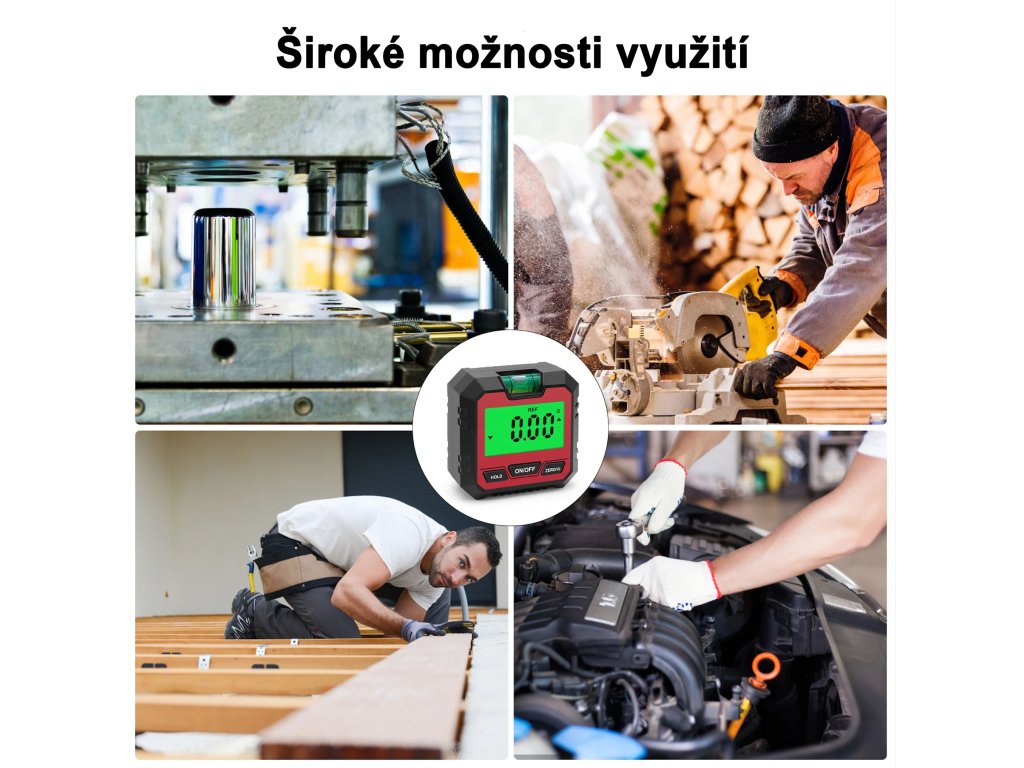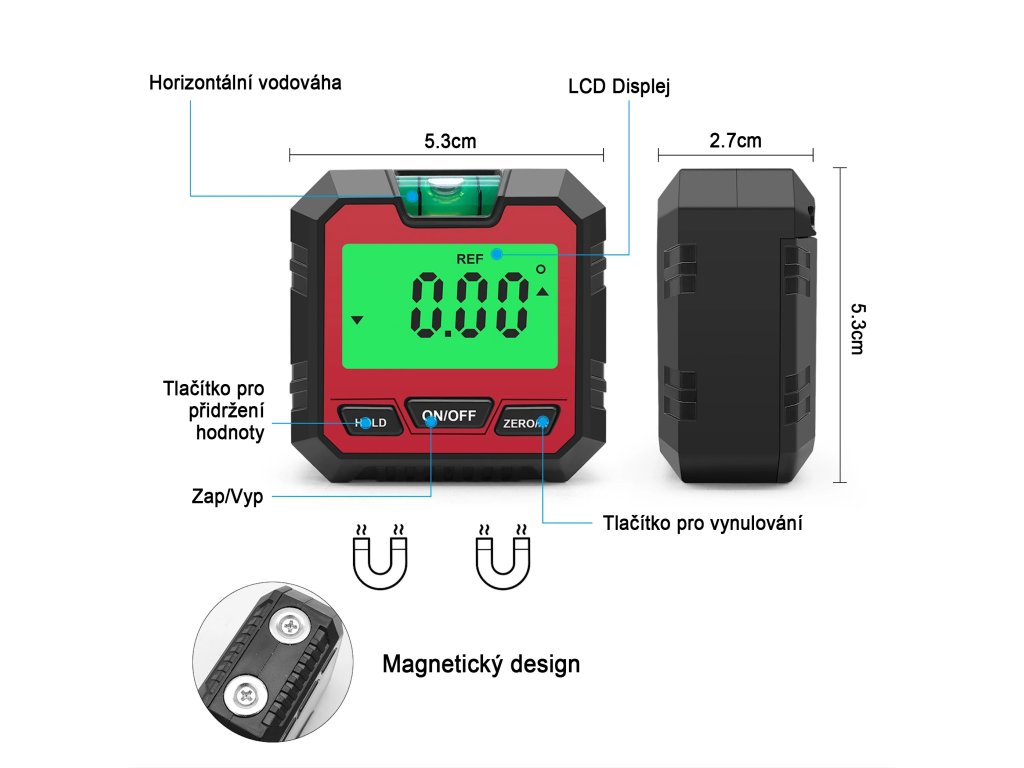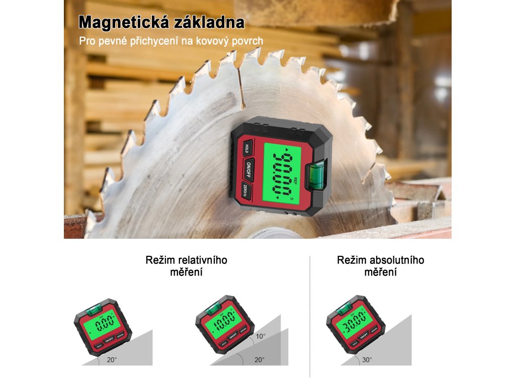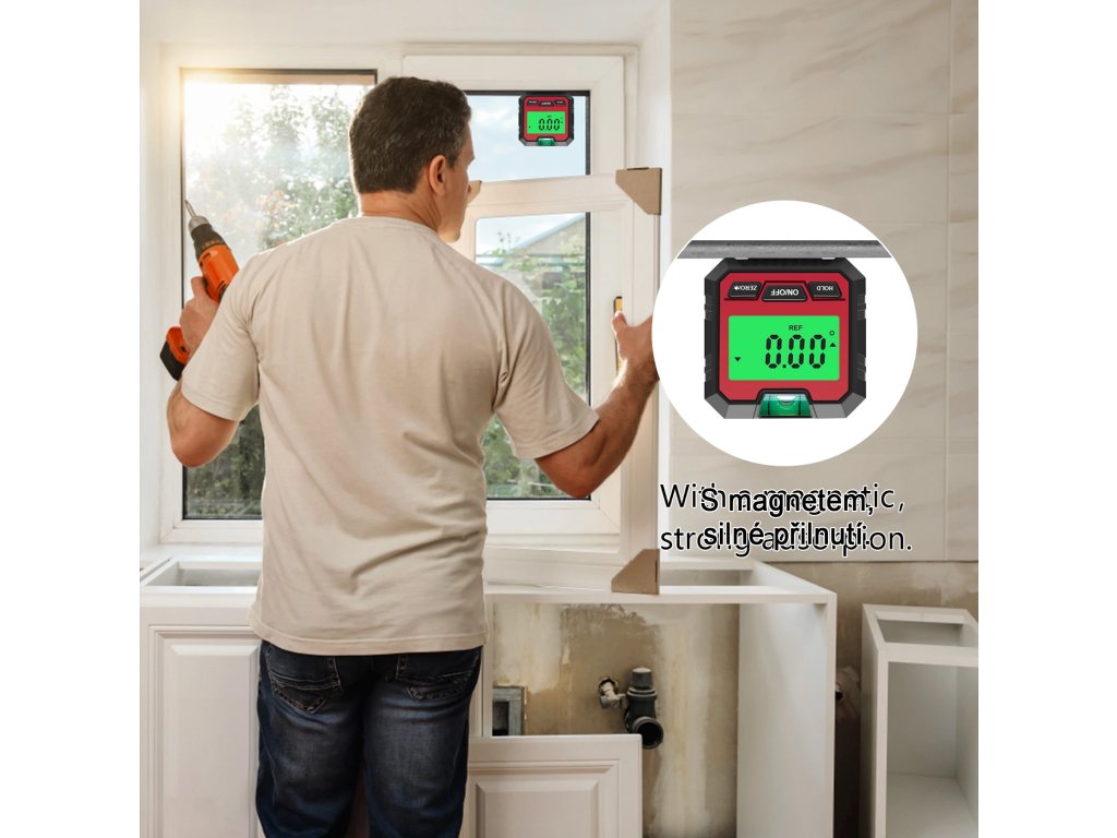 - Víceúčelový nástroj s magnetickou základnou: Přístroj je nástrojem 3 v 1, který slouží jako úhloměr, sklonoměr a vodováha. Jeho základna je vybavena magnetem, takže přilne k měřenému předmětu a lze jej používat bez použití rukou.