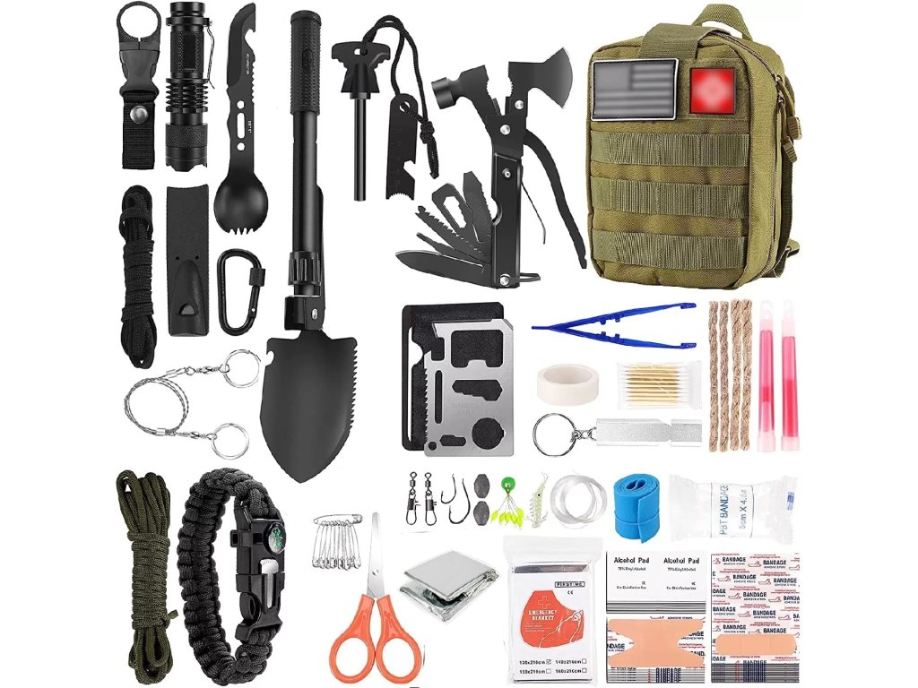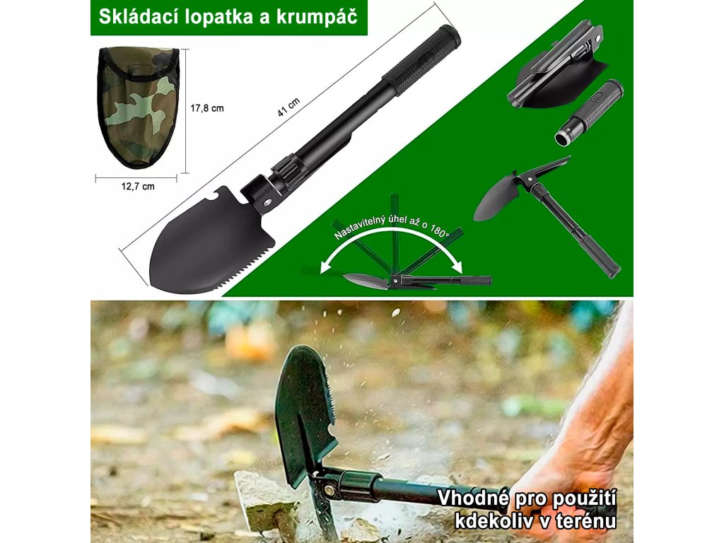 Tato sada spojuje praktické nástroje pro práci v terénu, orientaci i bezpečnost do jednoho kompaktního řešení. Obsahuje skládací lopatku s krumpáčem, výkonnou taktickou svítilnu, multifunkční nástroje, paracord, karabinu, chemická světla i dvoukomorovou píšťalku pro nouzovou signalizaci. Ideální volba pro kempování, turistiku, bushcraft i krizové situace, kdy potřebujete spolehlivou výbavu vždy po ruce.