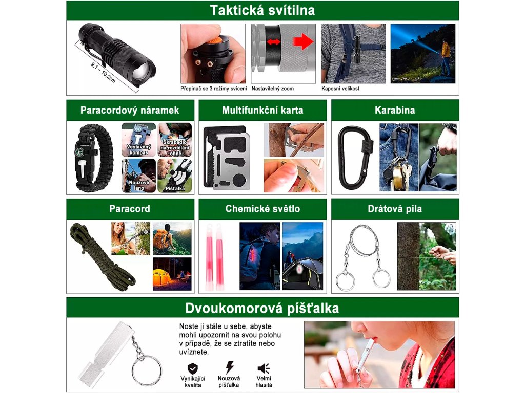 Tato multifunkční survival a outdoorová sada je navržena pro maximální připravenost v přírodě, při cestování i v krizových situacích. Spojuje široké spektrum odolných nástrojů, nouzových prvků a praktických doplňků do jednoho kompaktního a přehledně uspořádaného celku. Díky promyšlenému řešení nabízí vysokou všestrannost použití bez nutnosti nosit několik samostatných sad.