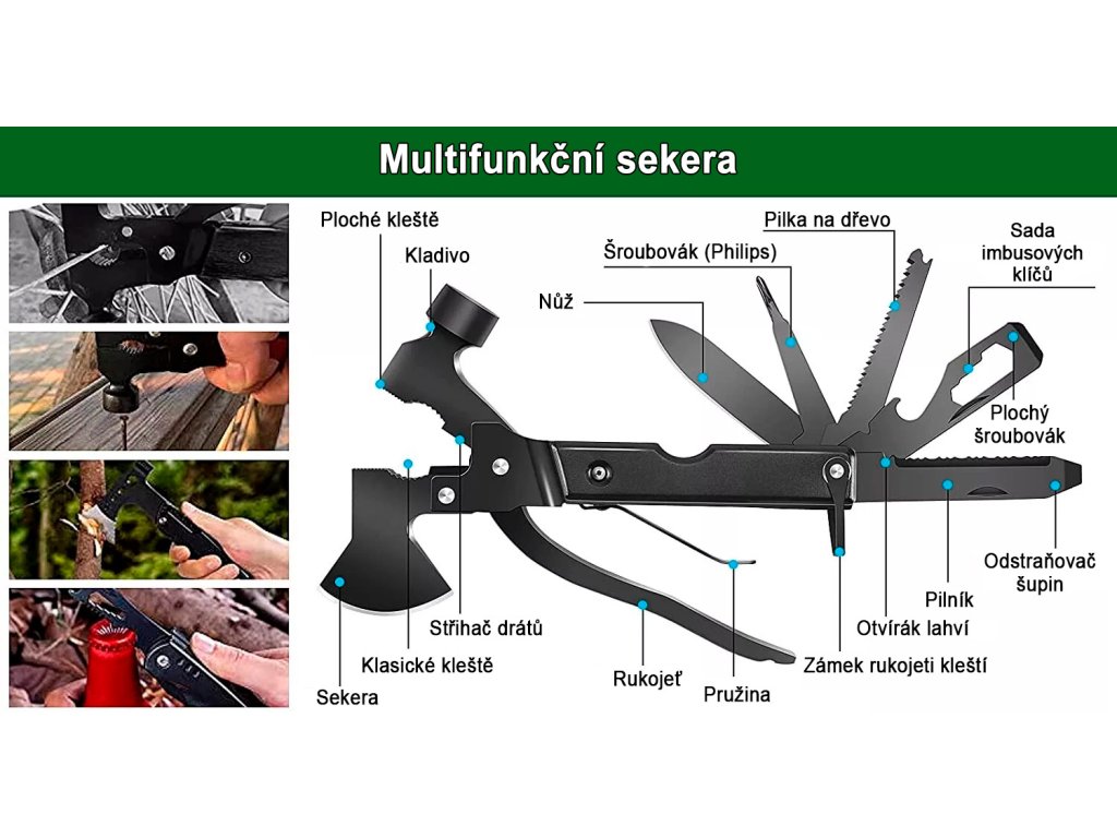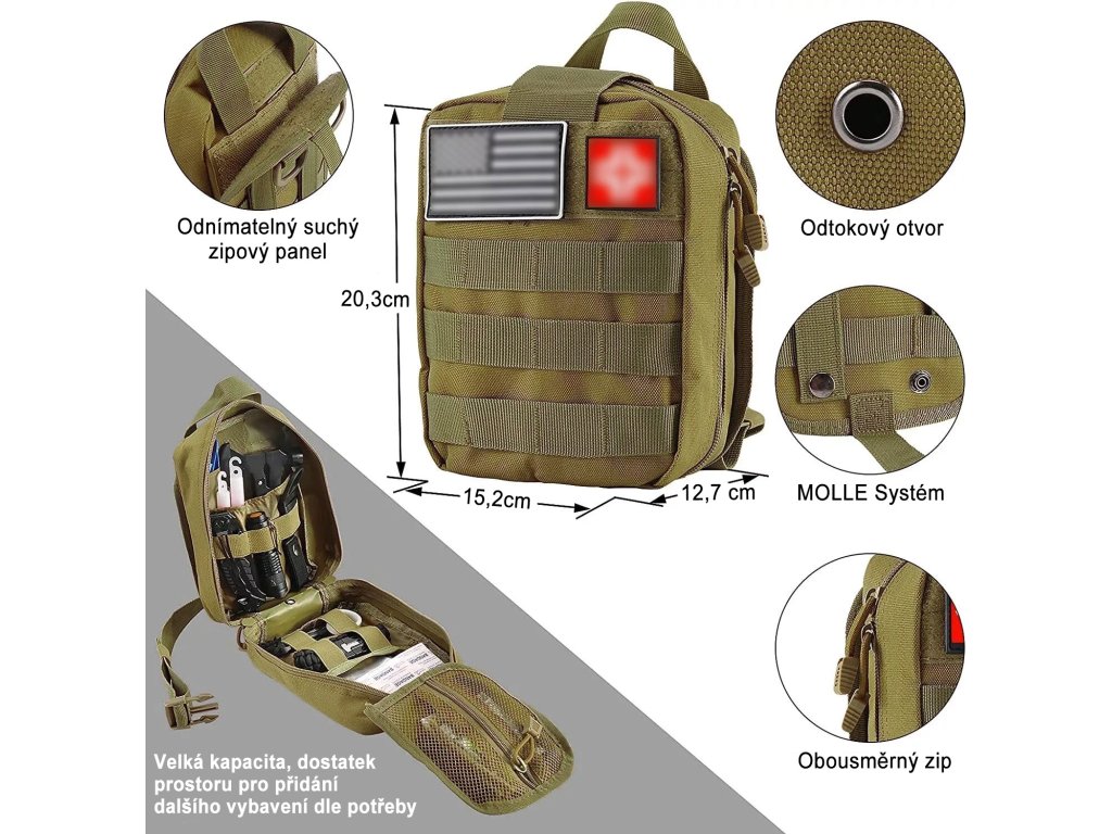 Odolná taktická brašna s MOLLE systémem, obousměrným zipem a praktickým odtokovým otvorem umožňuje mít veškerou výbavu přehledně a vždy po ruce. Součástí sady jsou multifunkční nástroje pro práci v terénu včetně sekery a nouzové termální fólie pro ochranu před chladem, což z ní dělá ideální volbu pro outdoor, cestování i krizové situace.
