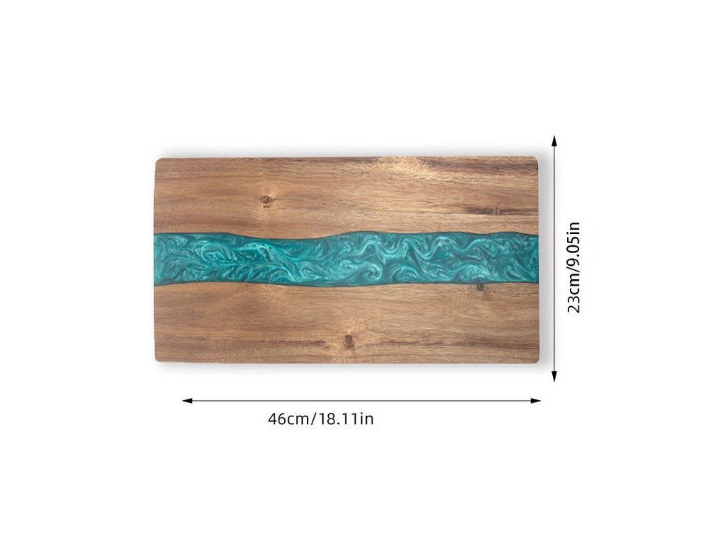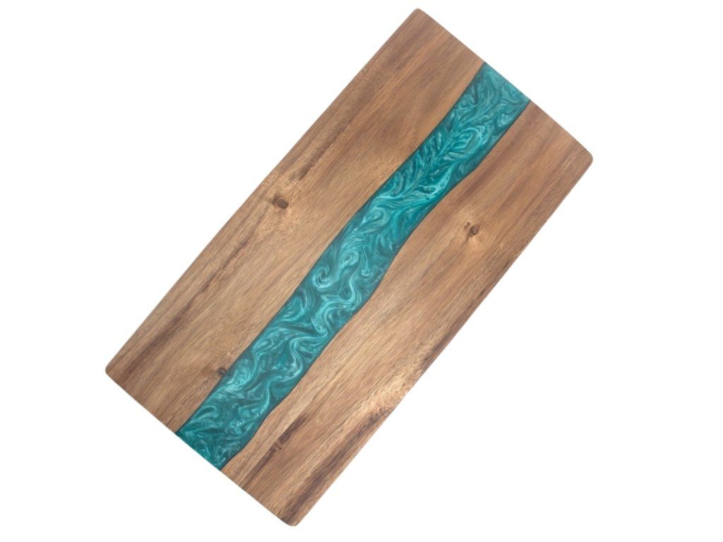 Designové servírovací prkénko z akáciového dřeva se zelenomodrou pryskyřicí