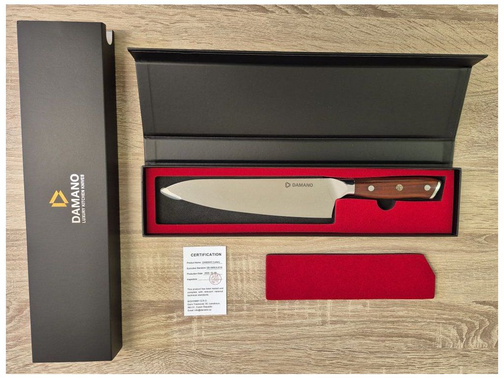 Profesionální nůž DAMANO® Chef DMS-456 si zaslouží pořádný obal. Přijde vám tak v originální dárkové krabičce. Spolu s ním dostanete i certifikát potvrzující jeho pravost a kvalitu.