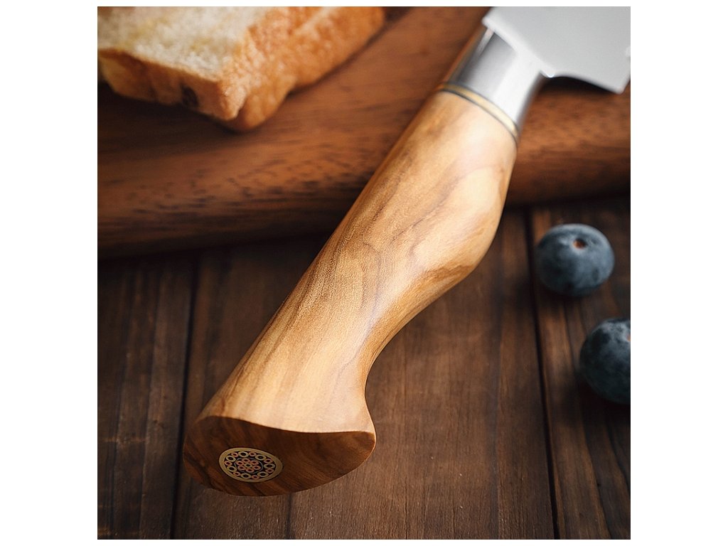 Rukojeť z olivovníku perfektně padne do ruky a zabraňuje sklouznutí prstů. Použité dřevo je tvrdé a odolné. A taky nádherně vypadá. Závěrečné opracování navíc zamezuje pohlcování pachů i vlhkosti. Díky tomu všemu je rukojeť odolná a pevná. Takže něco vydrží. A navíc nádherně vypadá. A právě díky tomu víte, že držíte v ruce kus poctivého řemesla. Díky tomu, že žádné dva kusy nejsou stejné.