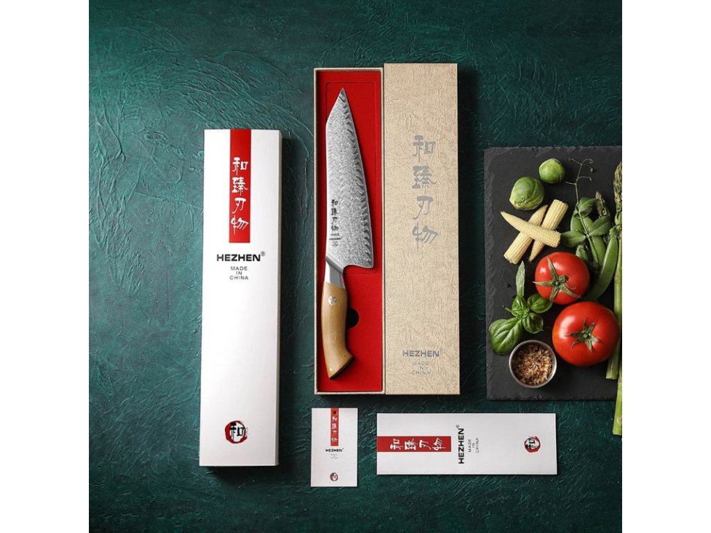 Profesionální nůž Hezhen® Chef B38L si zaslouží pořádný obal. Přijde vám tak v originální dárkové krabičce. Spolu s ním dostanete i certifikát potvrzující jeho pravost a kvalitu.
