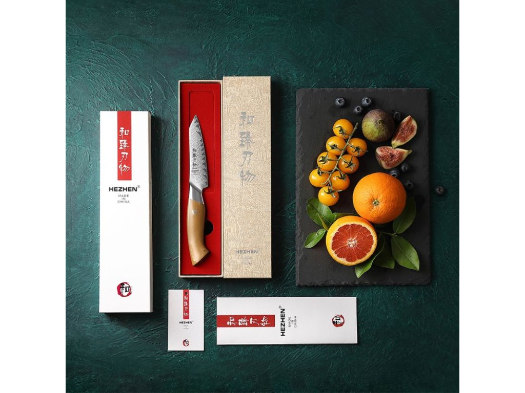 Profesionální nůž Hezhen® Paring B38L si zaslouží pořádný obal. Přijde vám tak v originální dárkové krabičce. Spolu s ním dostanete i certifikát potvrzující jeho pravost a kvalitu.