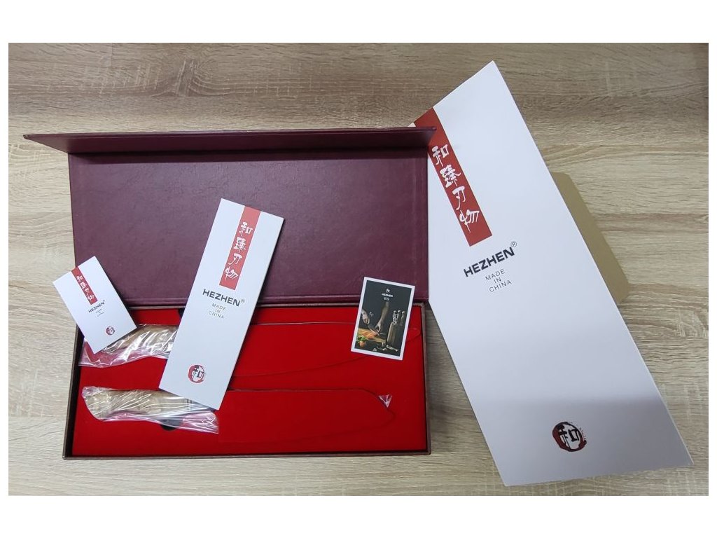 Profesionální nože Hezhen® B30 si zaslouží pořádný obal. Každý vám tak přijde v originální dárkové krabičce. Spolu s ní dostanete i certifikát potvrzující jejich pravost a kvalitu. Pokud sadu pořizujete jako dárek, doporučujeme k nim přihodit stojan z akáciového dřeva.