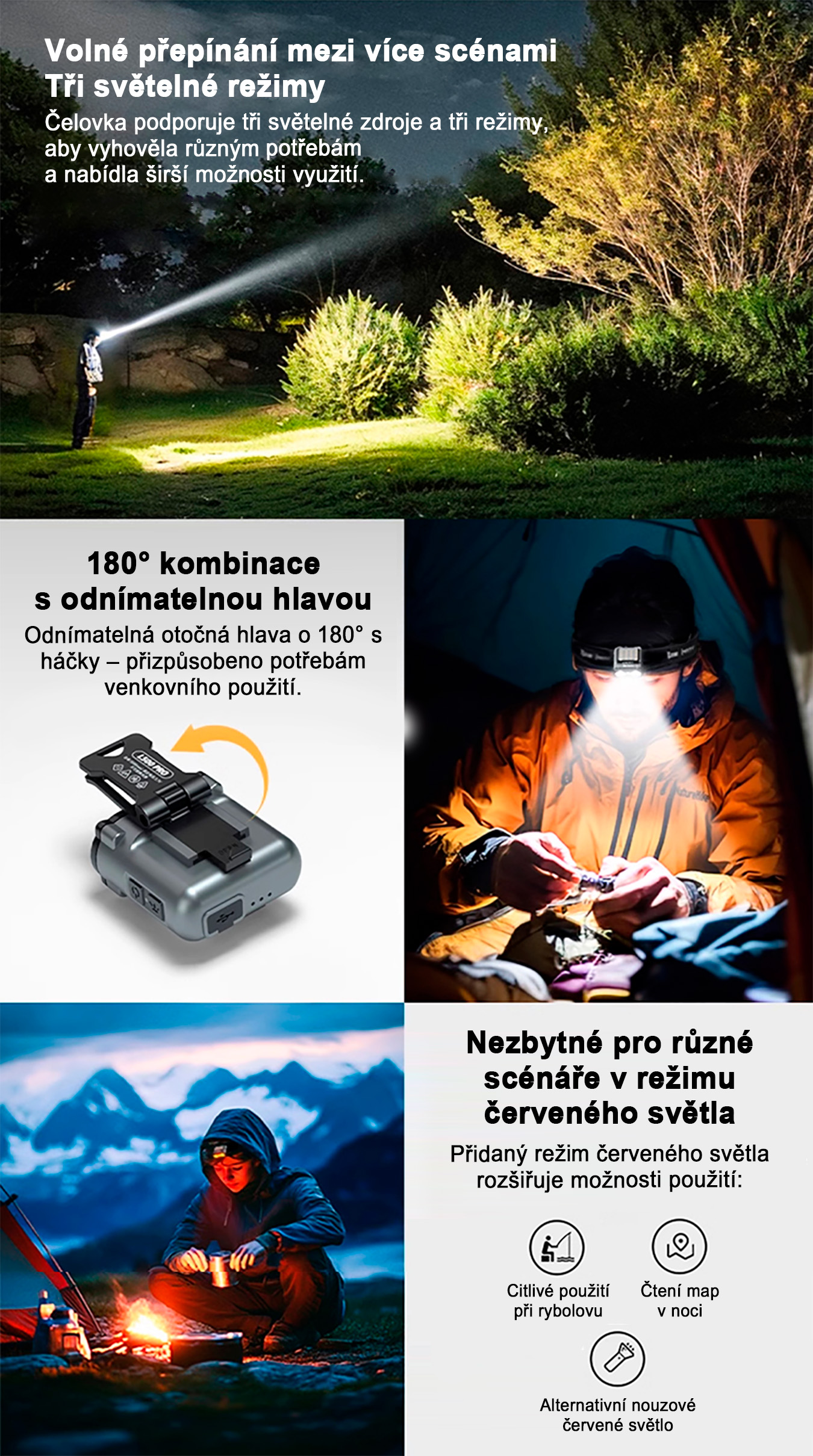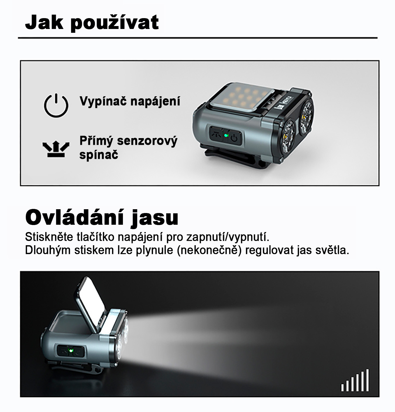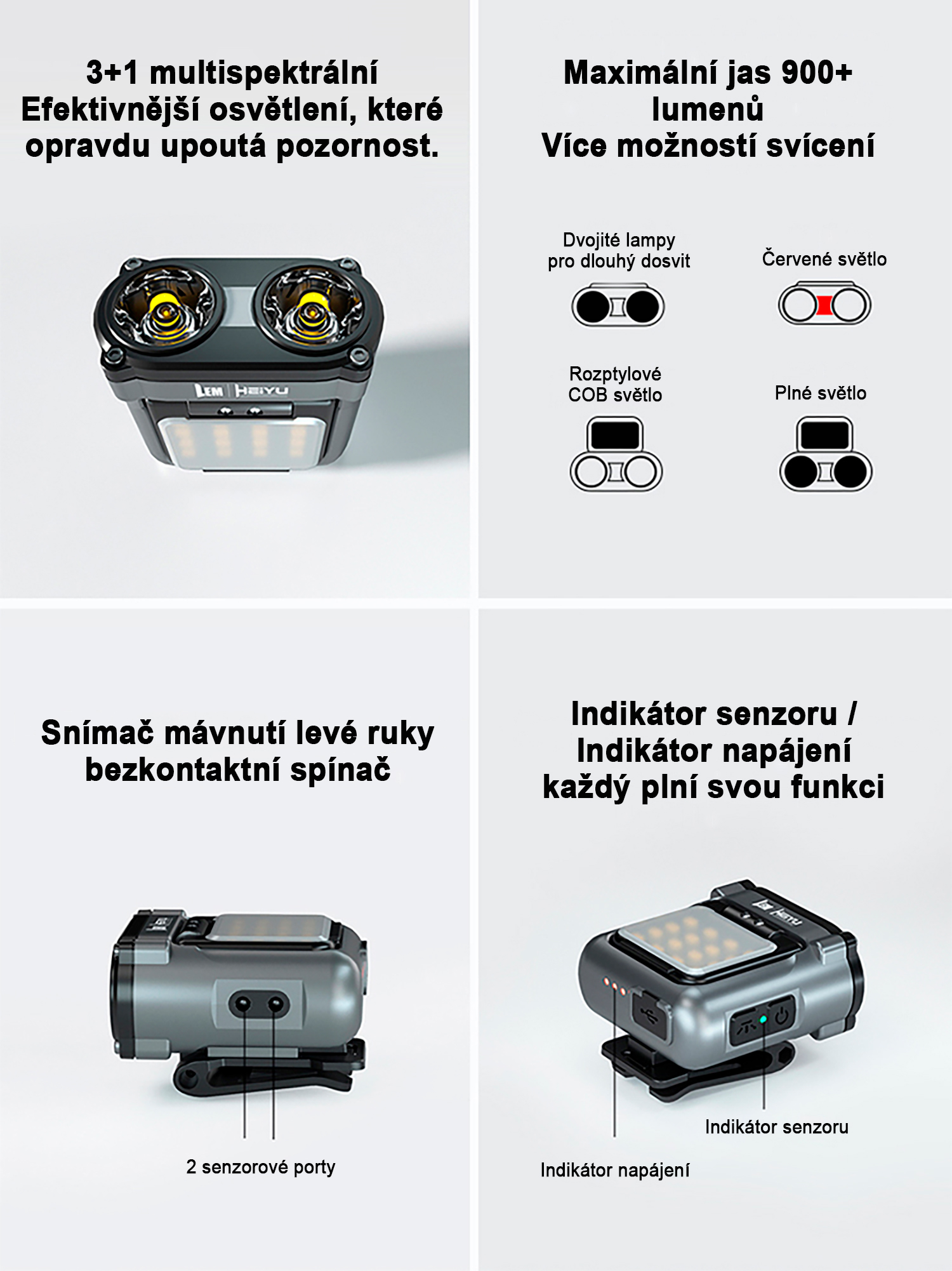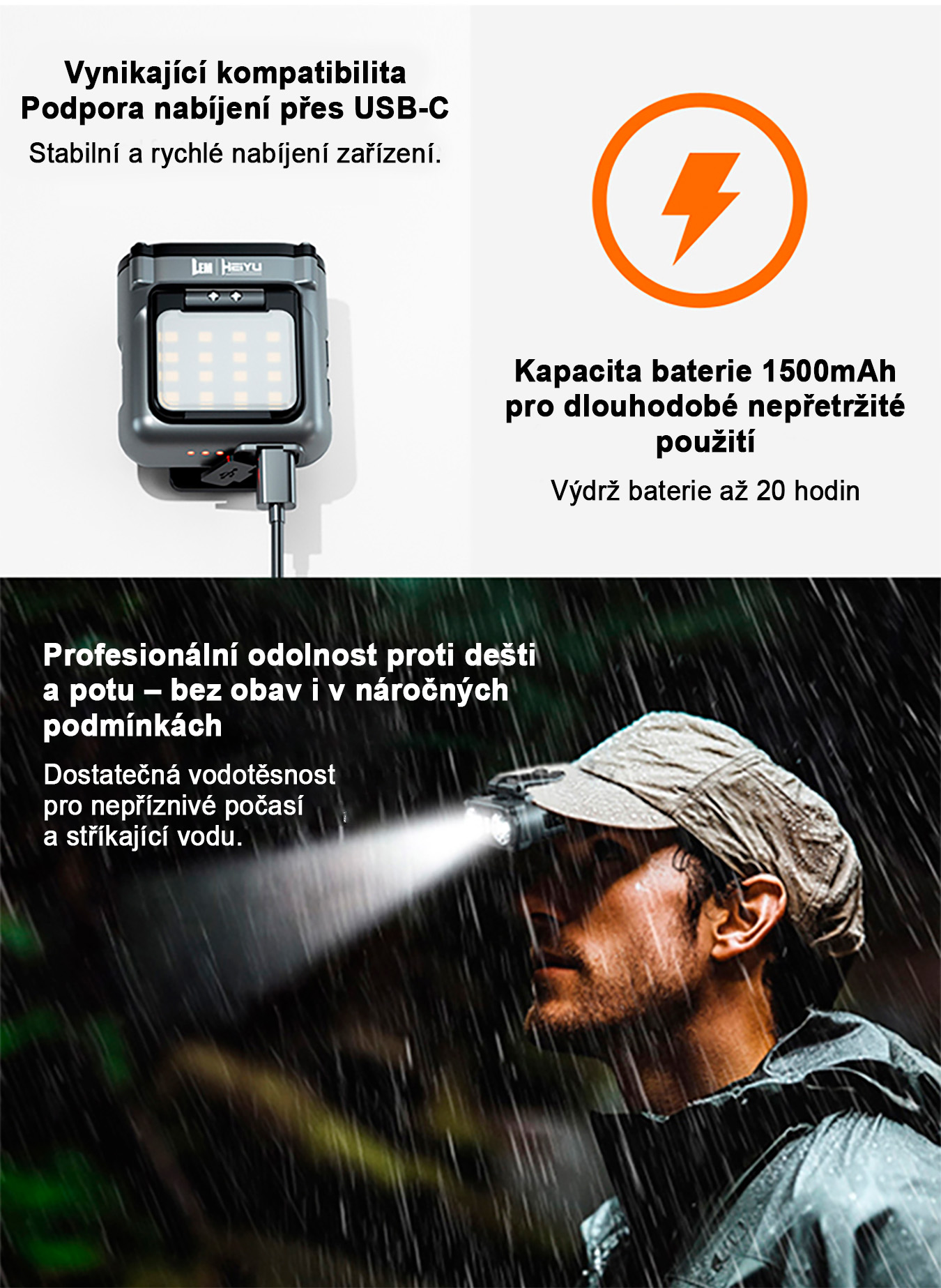 Díky senzorovému ovládání ji lze zapínat i vypínat mávnutím ruky, což je ideální při práci, sportu nebo rybaření. Čelovka je vybavena indikátorem napájení i senzoru, takže máte vždy přehled o jejím stavu. Nabíjení probíhá přes USB Type-C konektor s funkcí rychlého nabíjení.