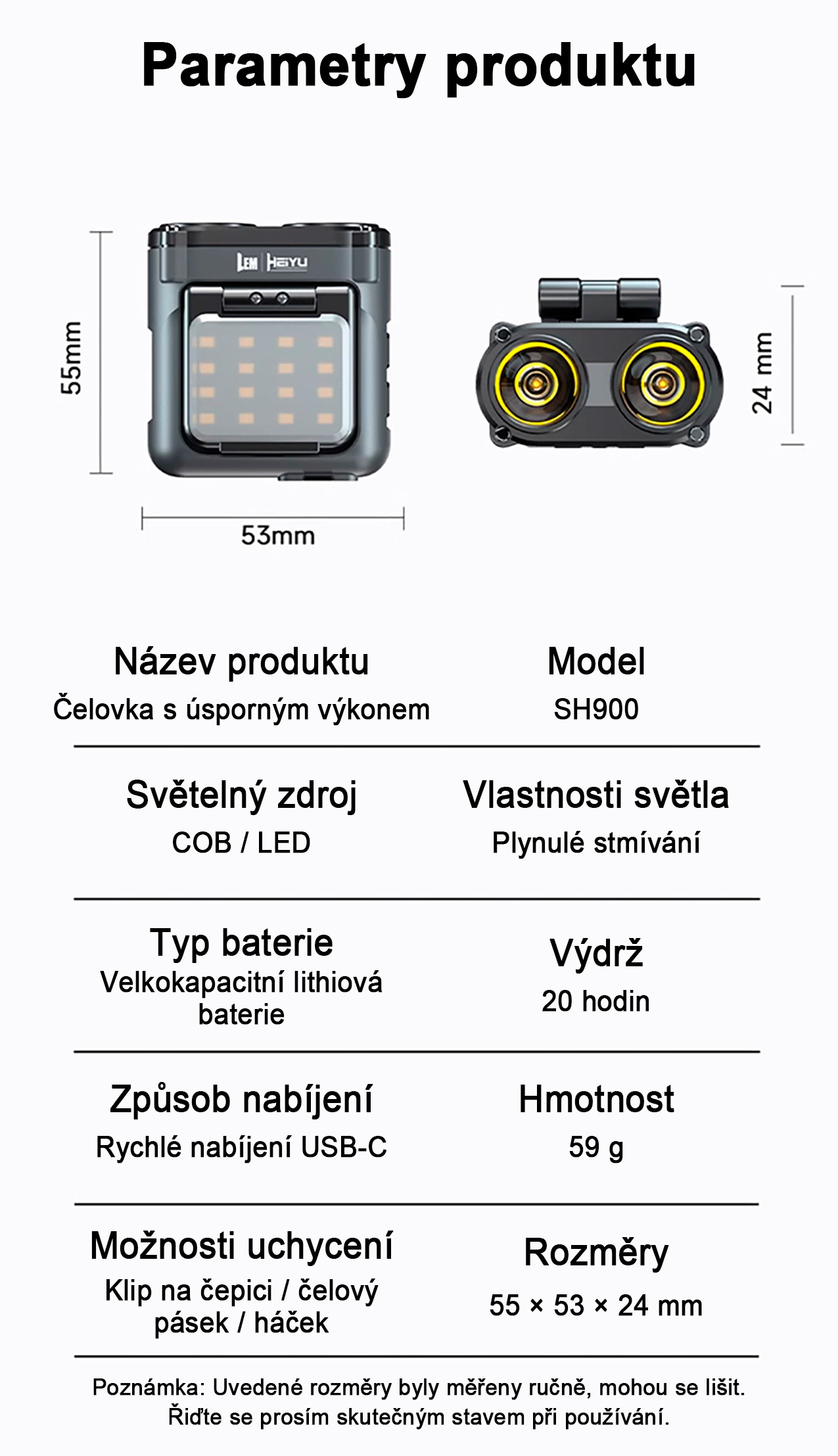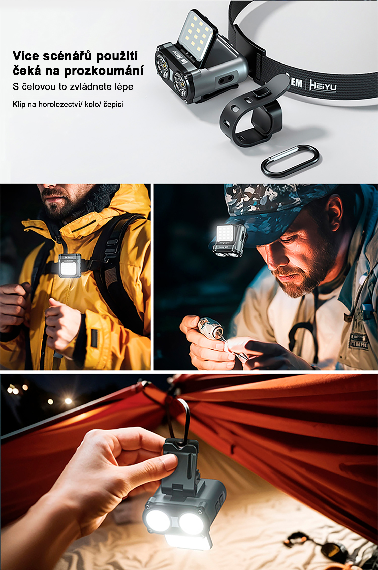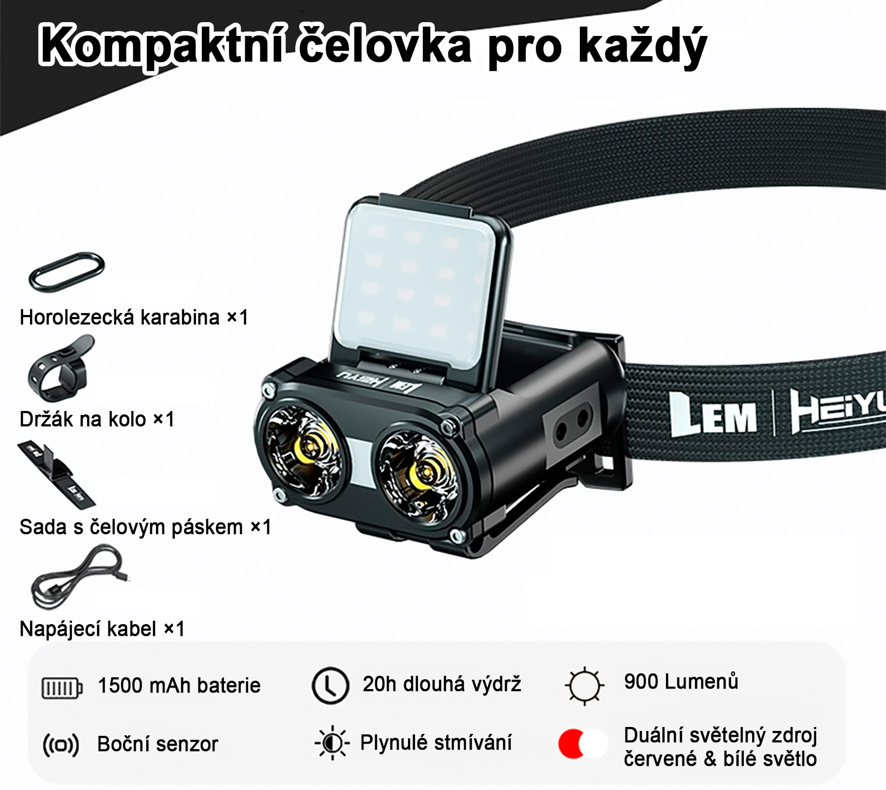 - Možnost uchycení na čepici, čelenku nebo háček