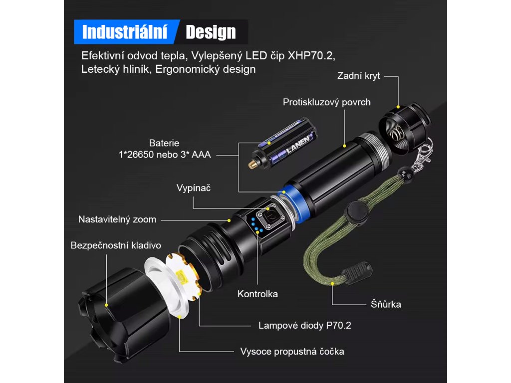Výkon 1000+ lumenů · Hmotnost 350 g · Napájení: 1 × 18650 nebo 26650 Baterie · Krytí IP65 ·