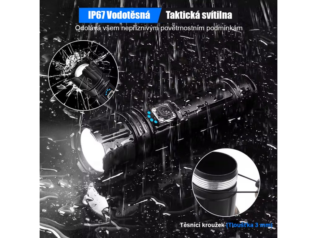 Výkon 2 000 lumenů · Krytí IP66 · Hmotnost 186,6 g · Více režimů (3 světelné zdroje)