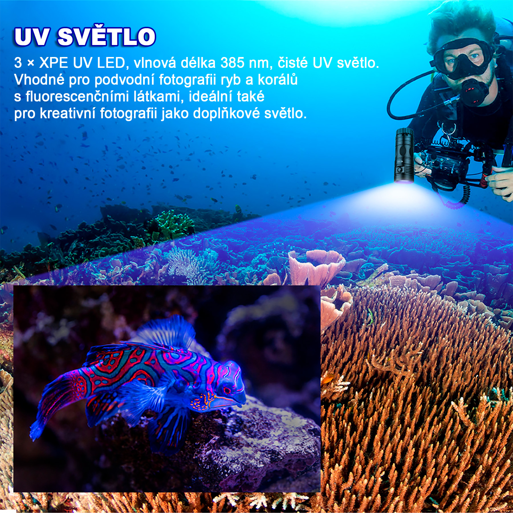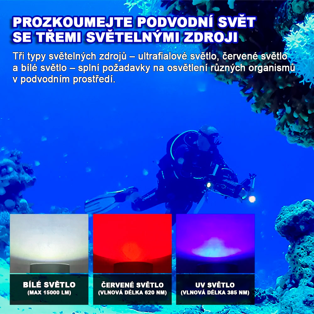 TrustFire DF90 je potápěčská svítilna navržená pro náročné podmínky pod vodou i nad hladinou. S maximálním světelným tokem až 15 000 lm a třemi typy LED (bílá, červená, UV) poskytuje variabilní osvětlení pro potápění, fotografii i průzkum. Dosah paprsku činí až 168 m. Vodotěsnost do 70 metrů zajišťuje, že svítilna funguje i ve větších hloubkách bez kompromisů.