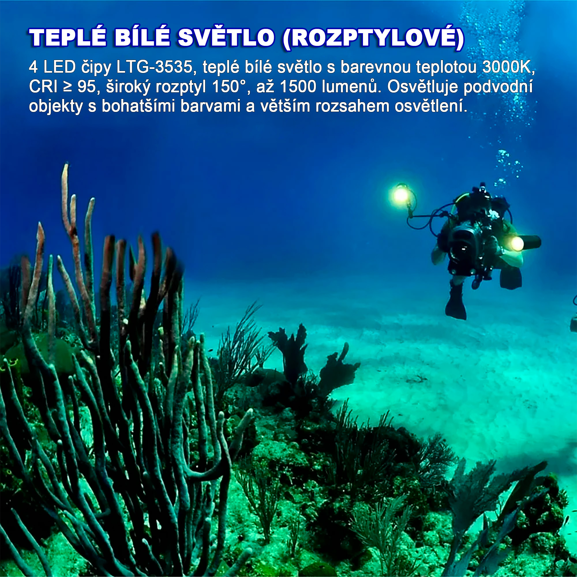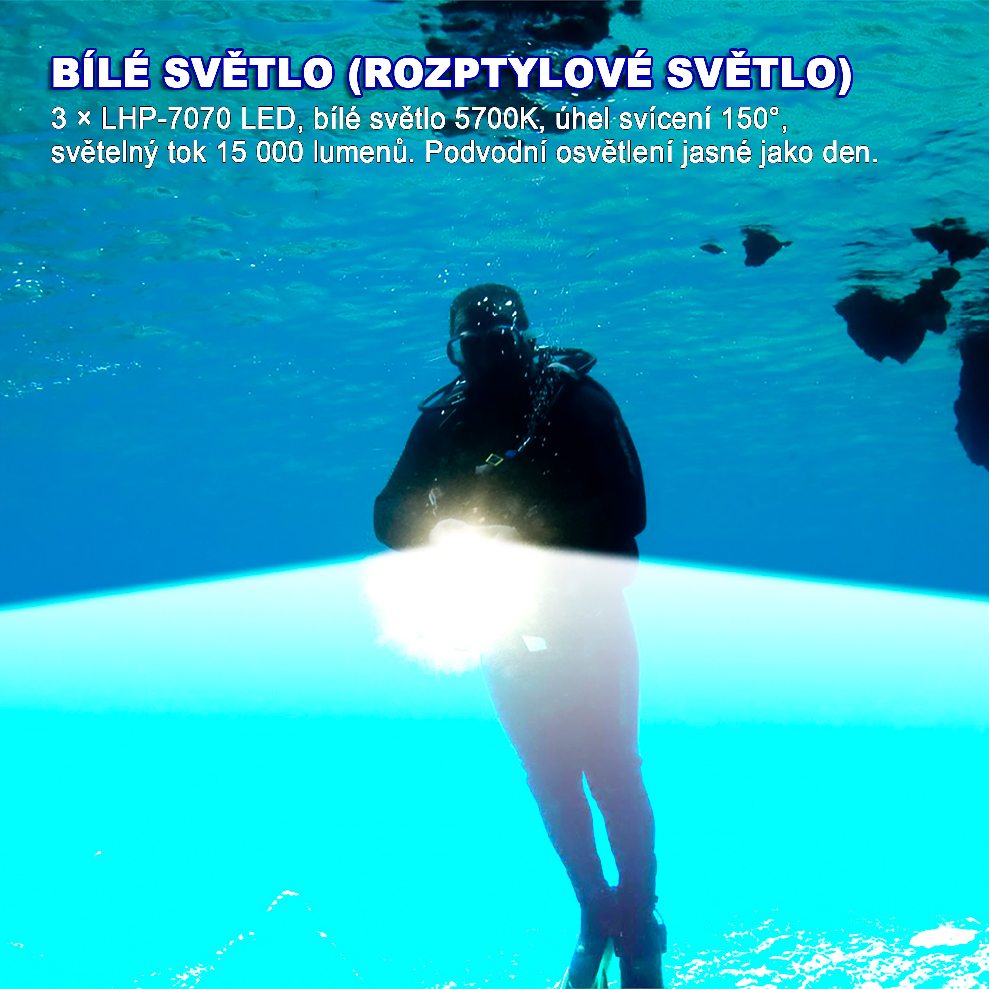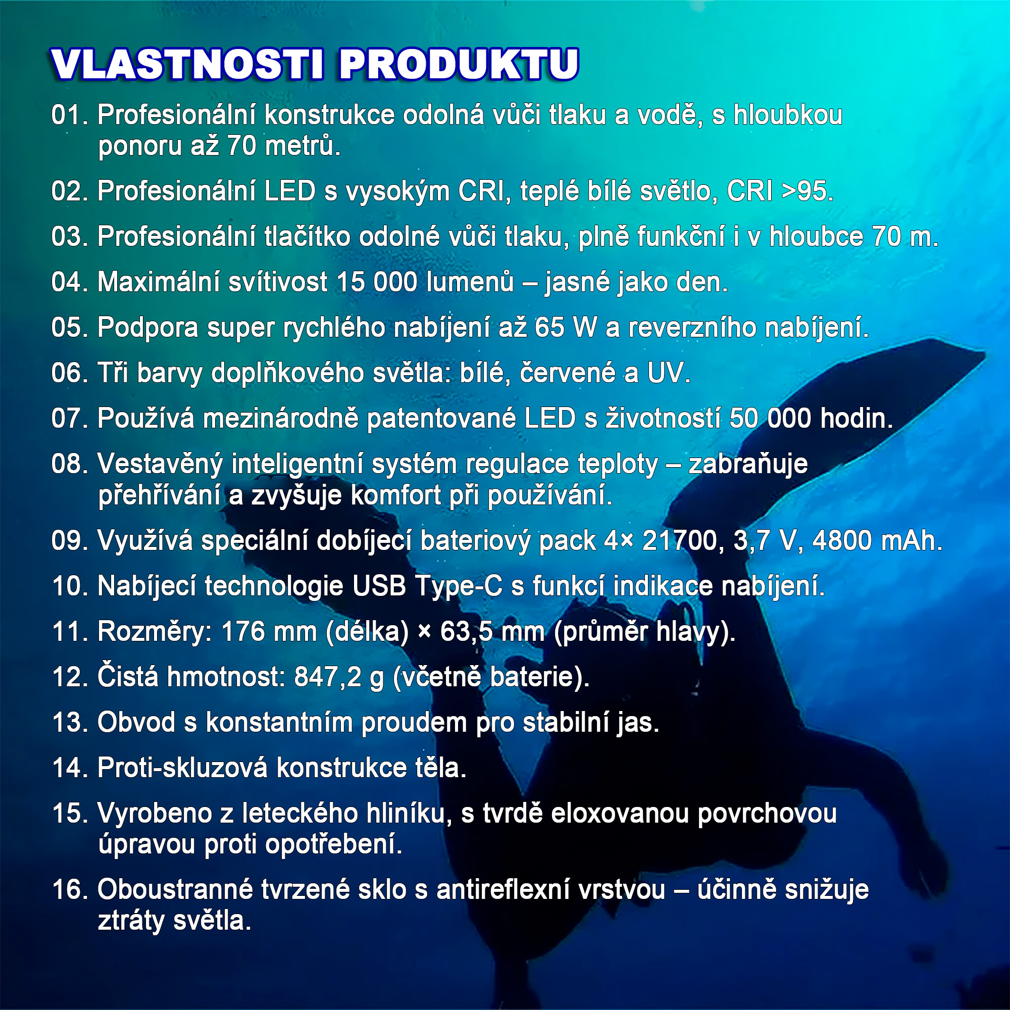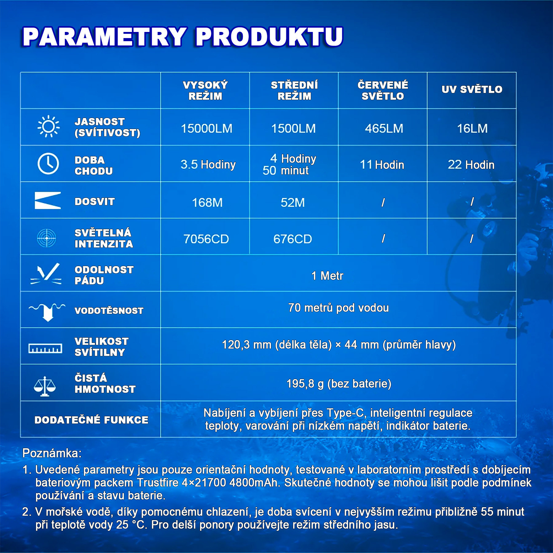Výkon 6 500 lumen · Dosvit 105 m · Vodotěsnost do 70 m · 3 různé LED · Hmotnost 294,6 g · Napájení 3 × 21...
