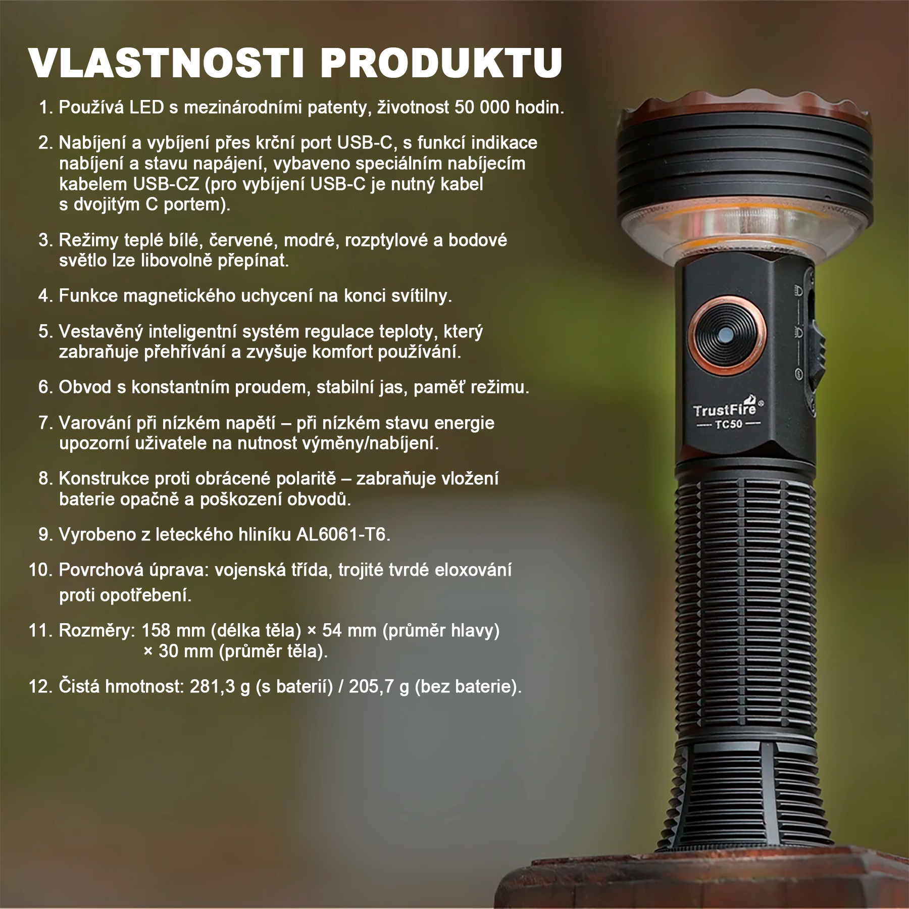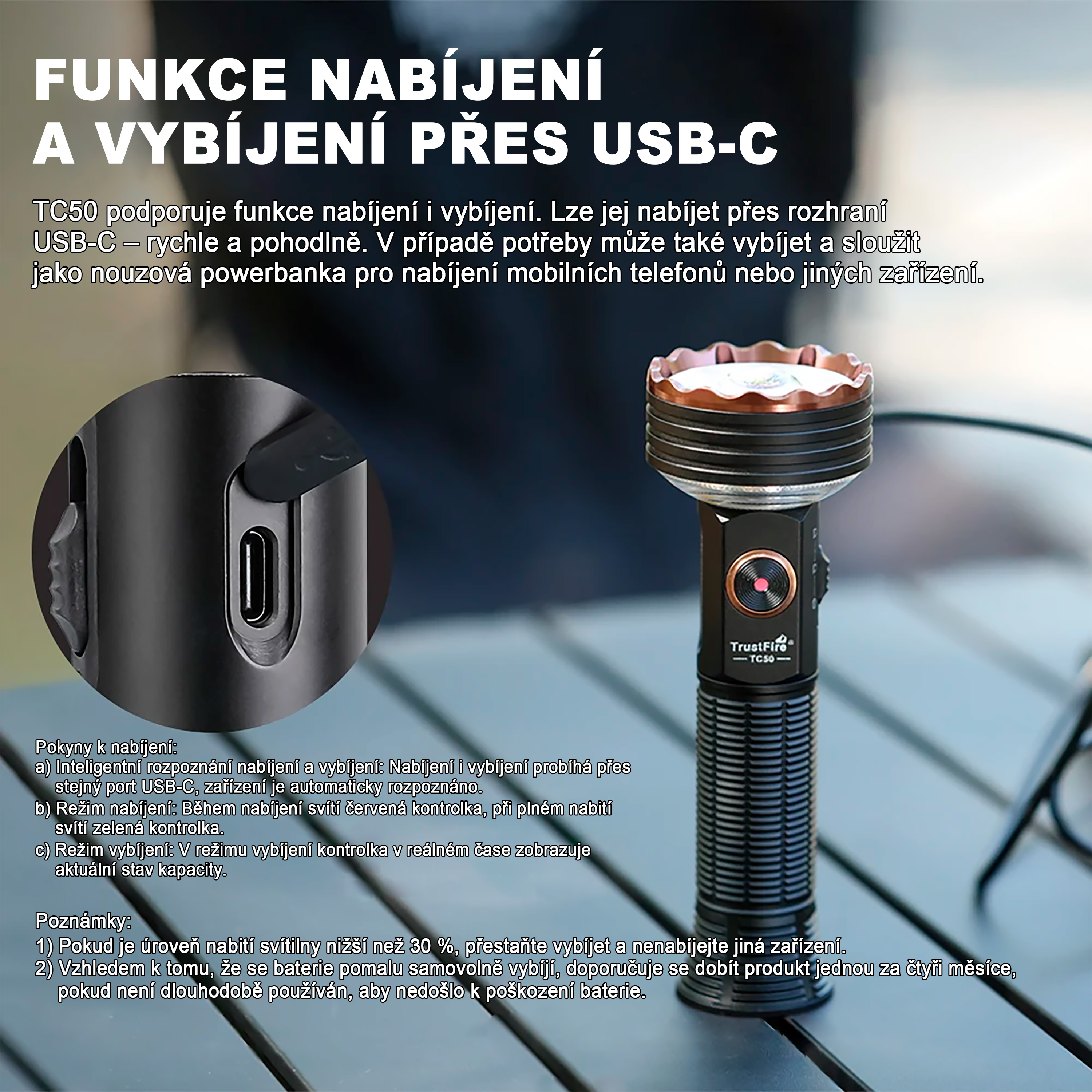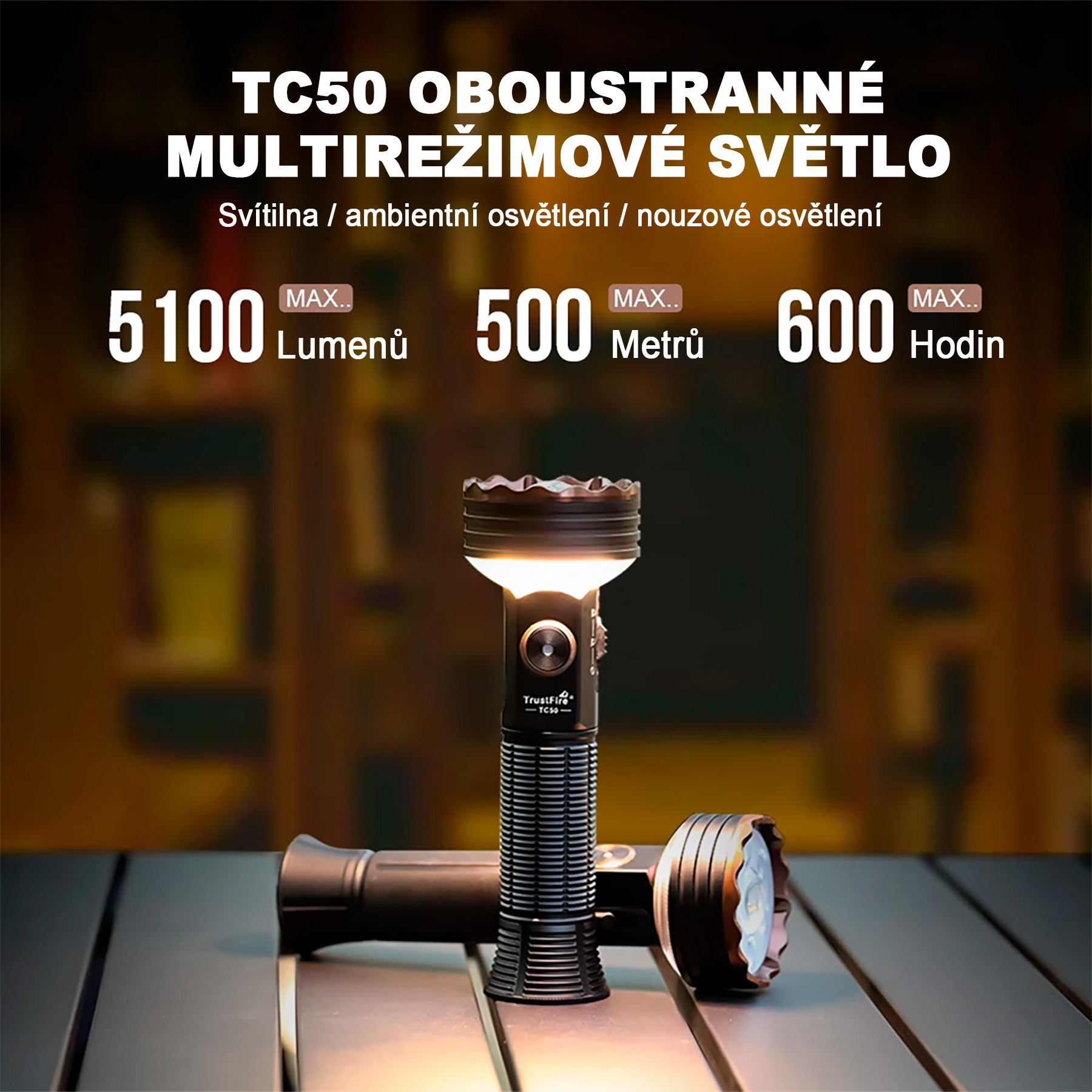 TrustFire TC50 je multifunkční svítilna, která kombinuje silný světelný výkon s praktickou funkcí power banky. Dosahuje až 5 100 lm a díky zoomu si nastavíte, jak úzký či široký kužel světla potřebujete. Nabízí více režimů pro různé situace — od intenzivního osvětlení, přes stroboskop až po ambientní světlo — a navíc umí fungovat jako externí nabíječka pro vaše mobilní zařízení.