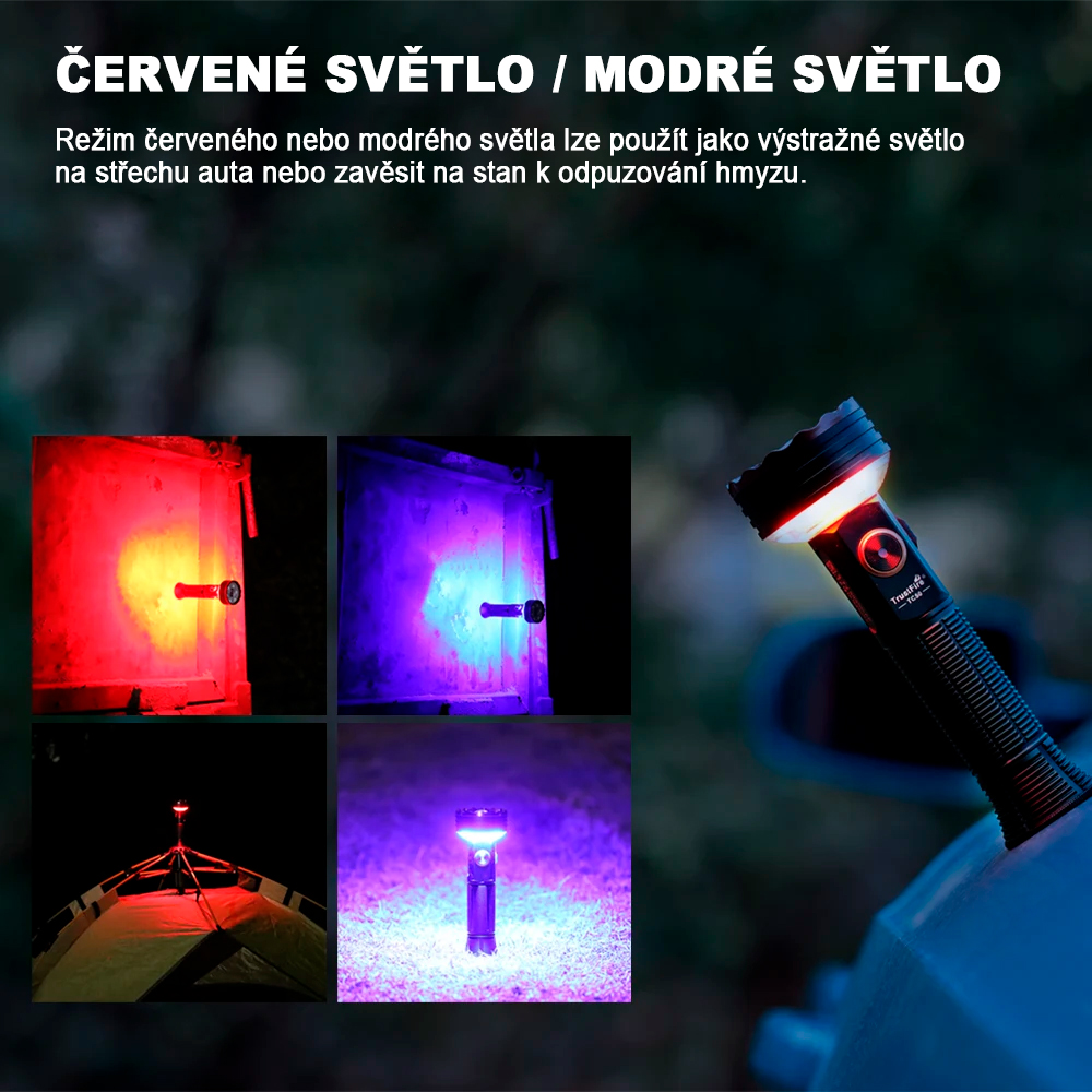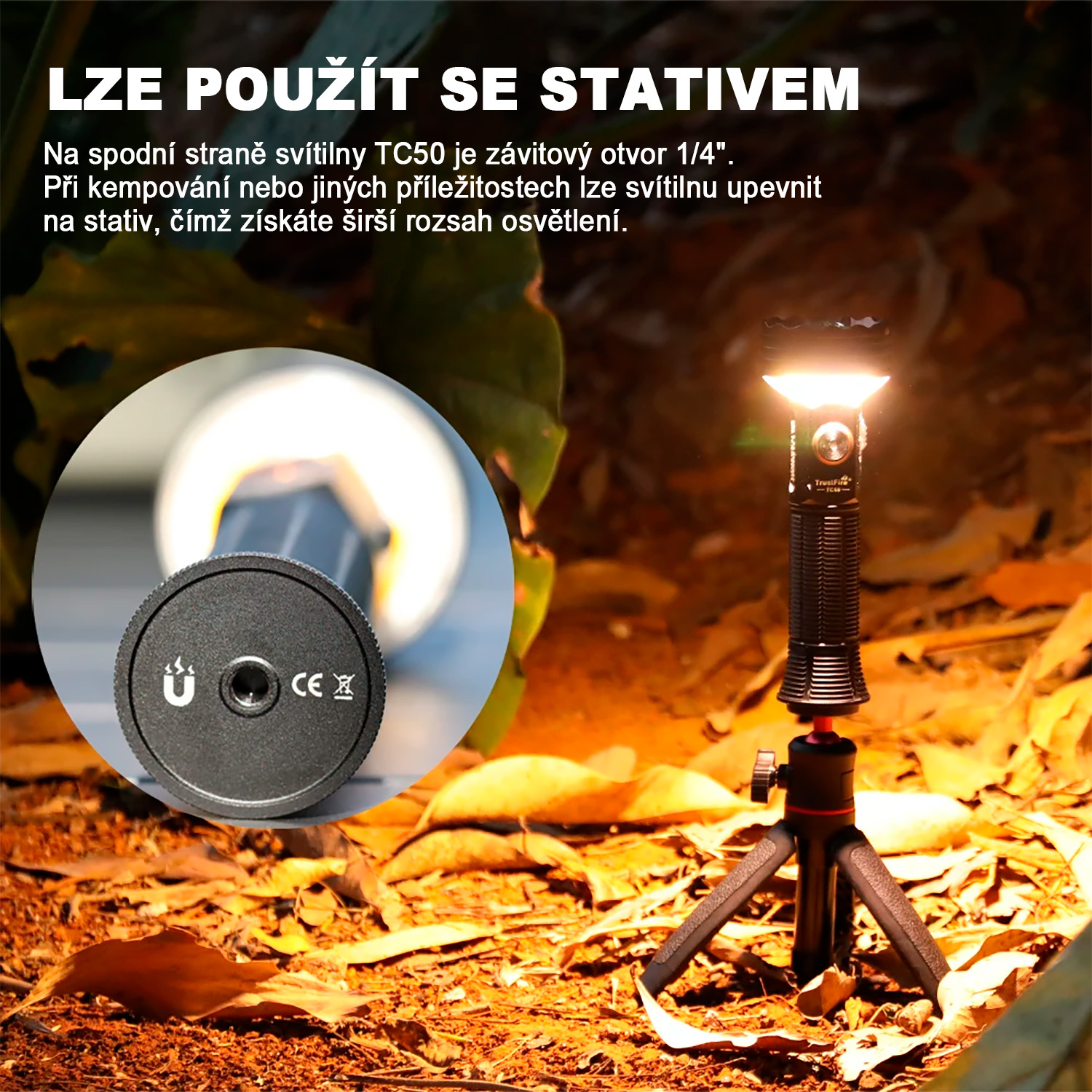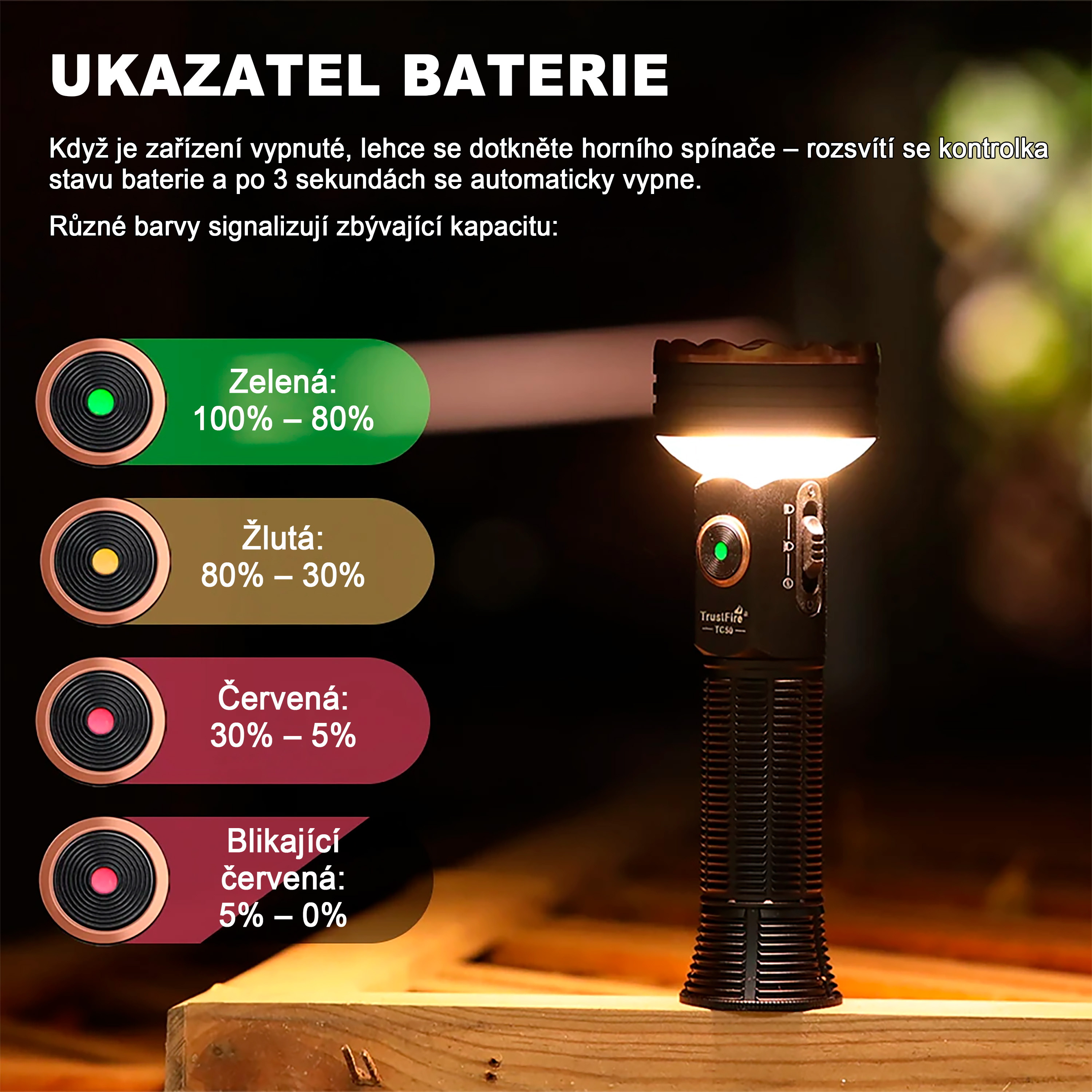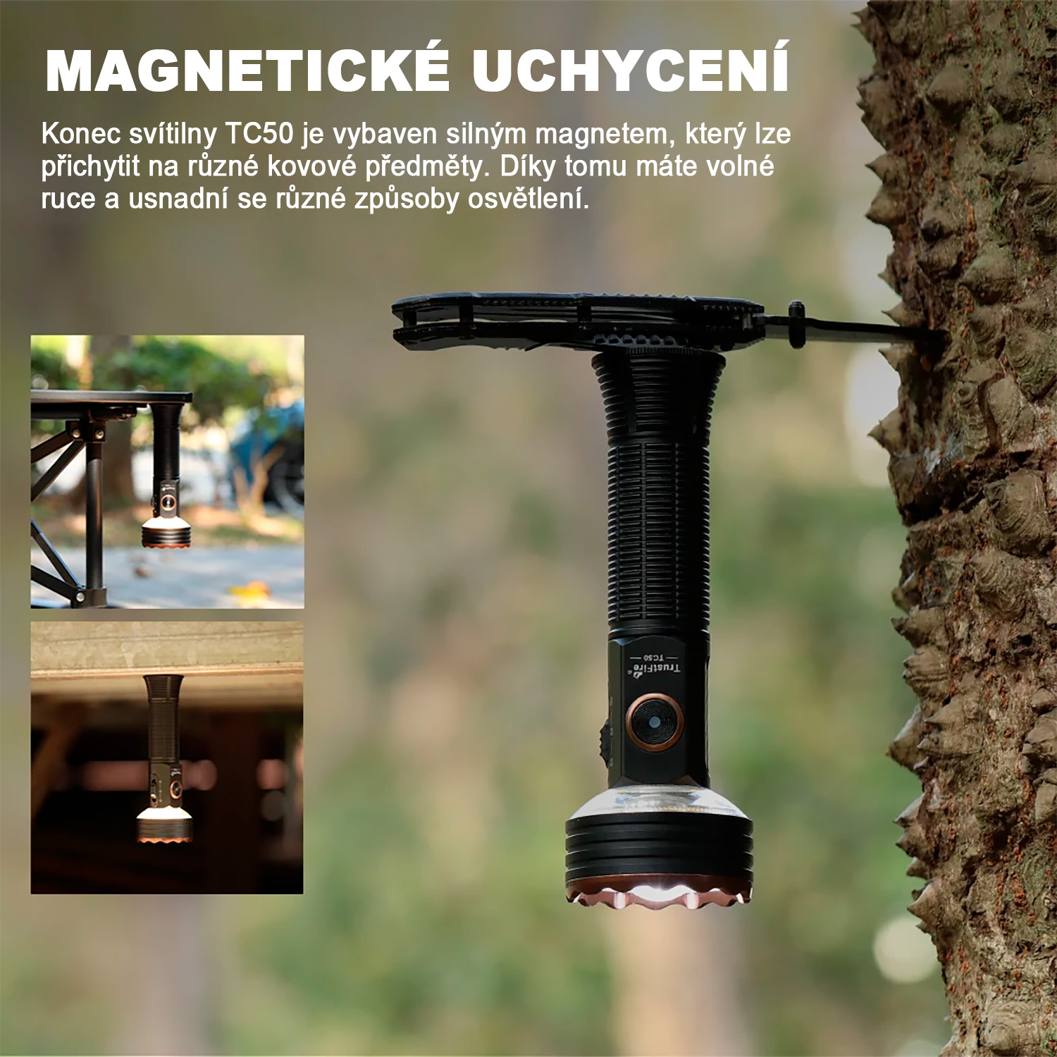 TrustFire TC50 je multifunkční svítilna, která kombinuje silný světelný výkon s praktickou funkcí power banky. Dosahuje až 5 100 lm a díky zoomu si nastavíte, jak úzký či široký kužel světla potřebujete. Nabízí více režimů pro různé situace — od intenzivního osvětlení, přes stroboskop až po ambientní světlo — a navíc umí fungovat jako externí nabíječka pro vaše mobilní zařízení.