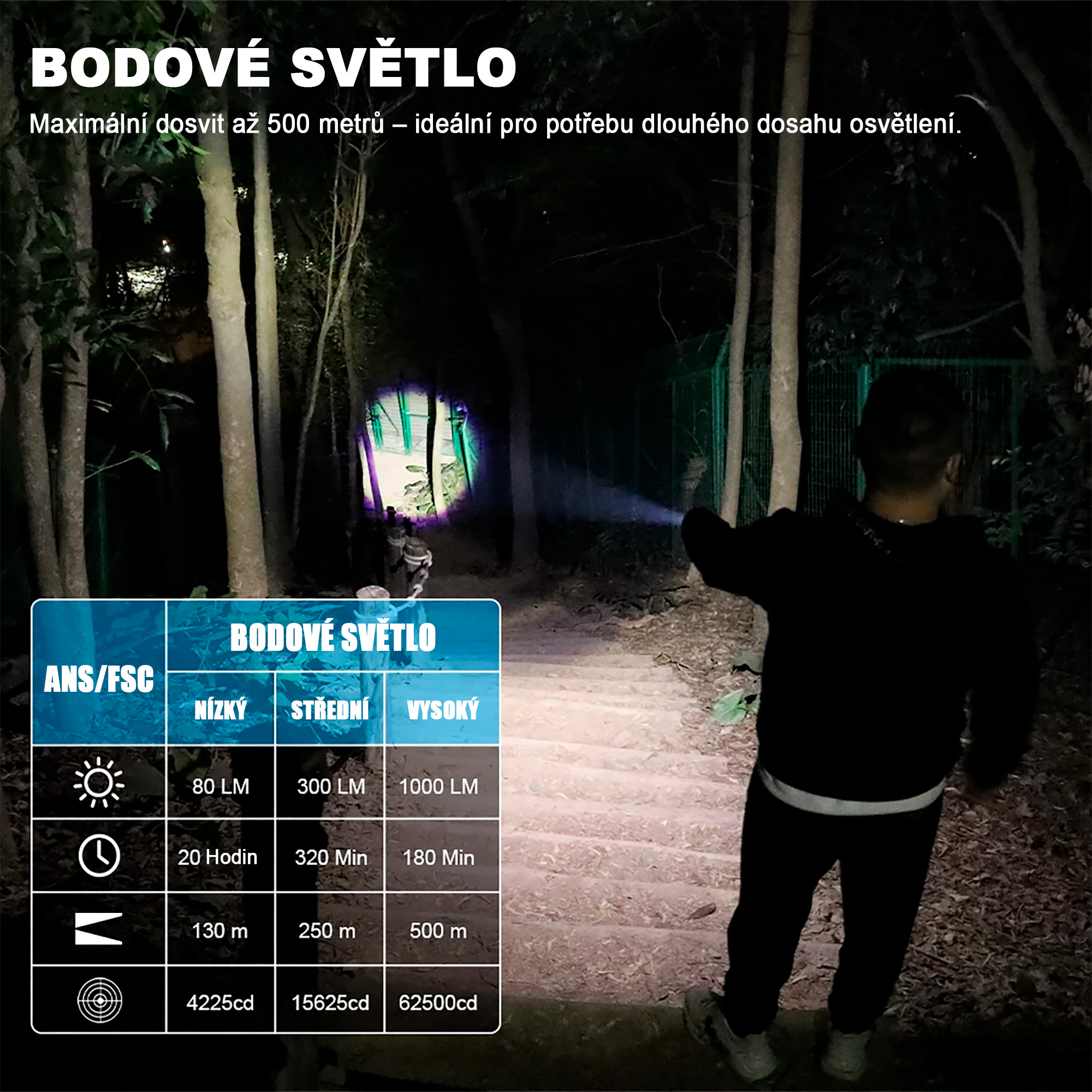 Výkon 500 lumenů · Dosvit 600 m · Krytí IP65 · Hmotnost 500 g · 7 režimů