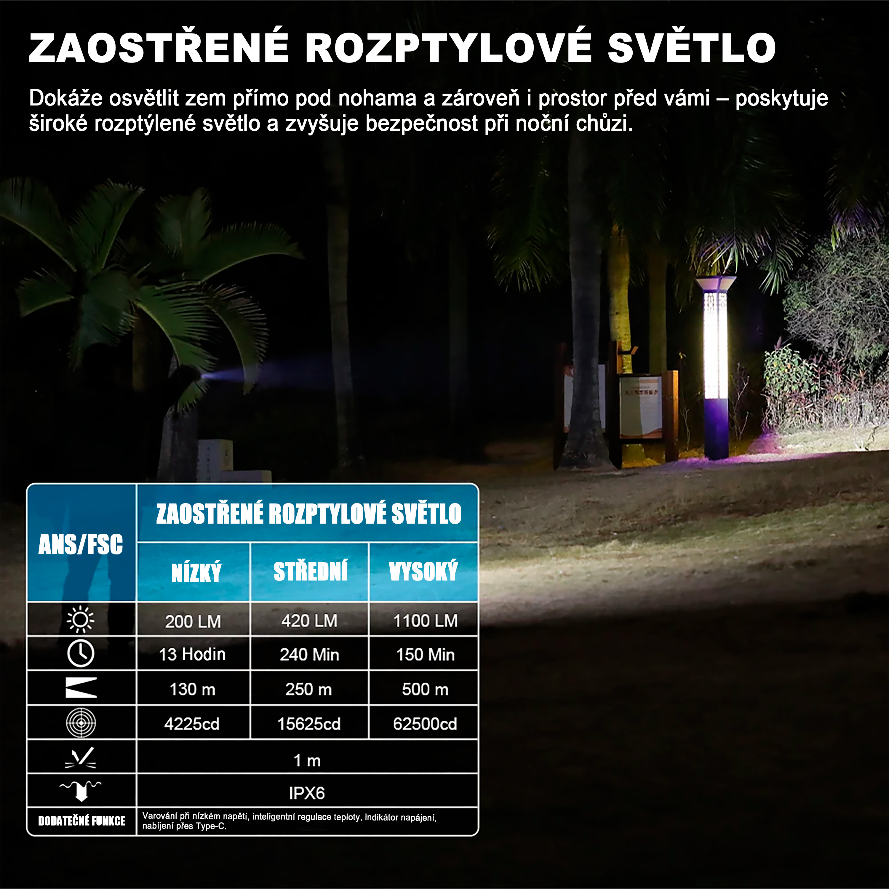 Výkon 3 300 lumenů · Krytí IP68 · Hmotnost 200 g · Více režimů