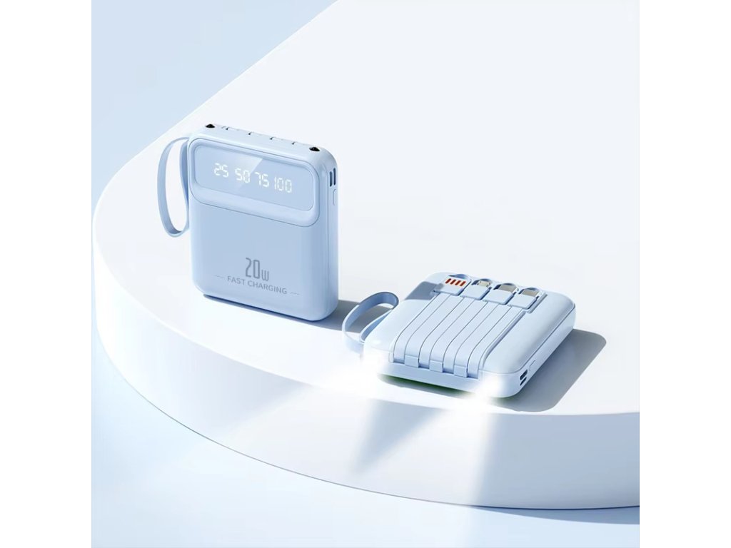 Tato kompaktní powerbanka s kapacitou 5000 mAh nabízí praktické a okamžitě použitelné řešení nabíjení na cestách. Díky čtyřem vestavěným kabelům, rychlému 20W výstupu, LED displeji a nouzové svítilně je ideálním doplňkem pro každodenní použití.