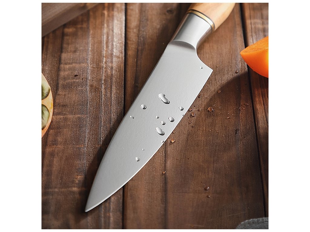 Materiál ostří je alfou a omegou. Právě proto v manufaktuře sáhli po nerezové speciální vysocekvalitní oceli. Kombinuje všechno, co je v kuchyni třeba. Je odolná, tvrdá, ale zároveň dostatečně houževnatá. Nedochází tak k lámání ani korozi. Navíc se jednoduše brousí, takže vysoké ostrosti se dá jednoduše dosáhnout. Nůž vám tak bude sloužit po generace.