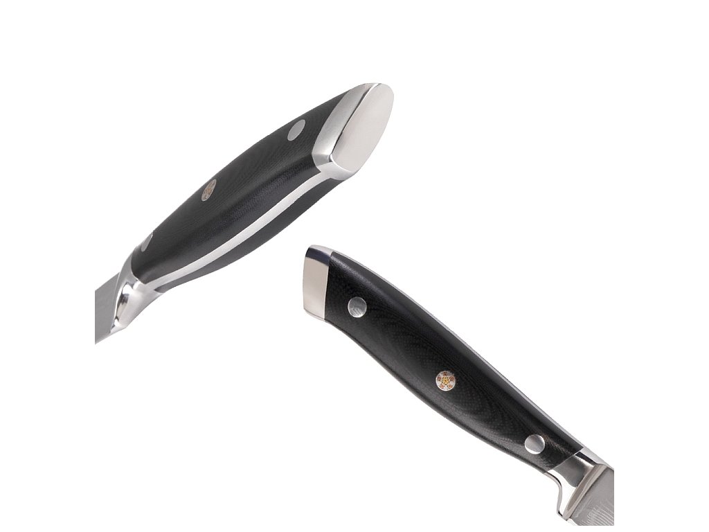 Ergonomicky tvarovaná rukojeť je vyrobena z extrémně odolného, přesto lehkého materiálu G10. Perfektně padne do ruky, takže se nůž jednoduše ovládá a zaručuje jistý pohyb. Povrch je totiž nepřilnavý, ale zároveň zabraňuje nechtěnému sklouznutí prstů. Nenasává vlhkost ani pachy. Vydrží tak i drsnější zacházení. A hlavně dlouhé roky bez známek opotřebení.