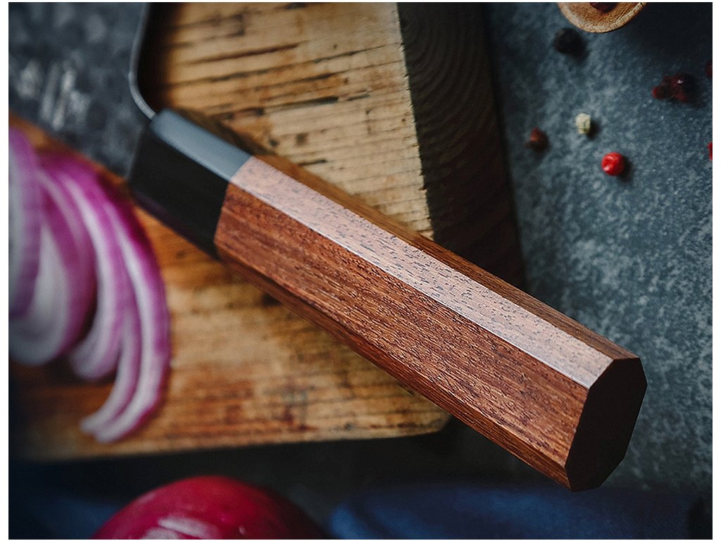 Čepel nože je vyrobená ze speciální třívrstvé kompozitní oceli, která připomíná ocel damaškovou. A ne náhodou. Podobné totiž mají i vlastnosti. Takže nůž nejen krásně vypadá, ale taky se s ním dokonale pracuje. Je ostrý, odolný a nerezavějící. Navzdory tomu je ale mnohem lehčí než nože z klasické oceli. Navíc se každý kus ručně ková i brousí. A tak mohou mistři v manufaktuře Xinzuo® vychytat každičký detail.