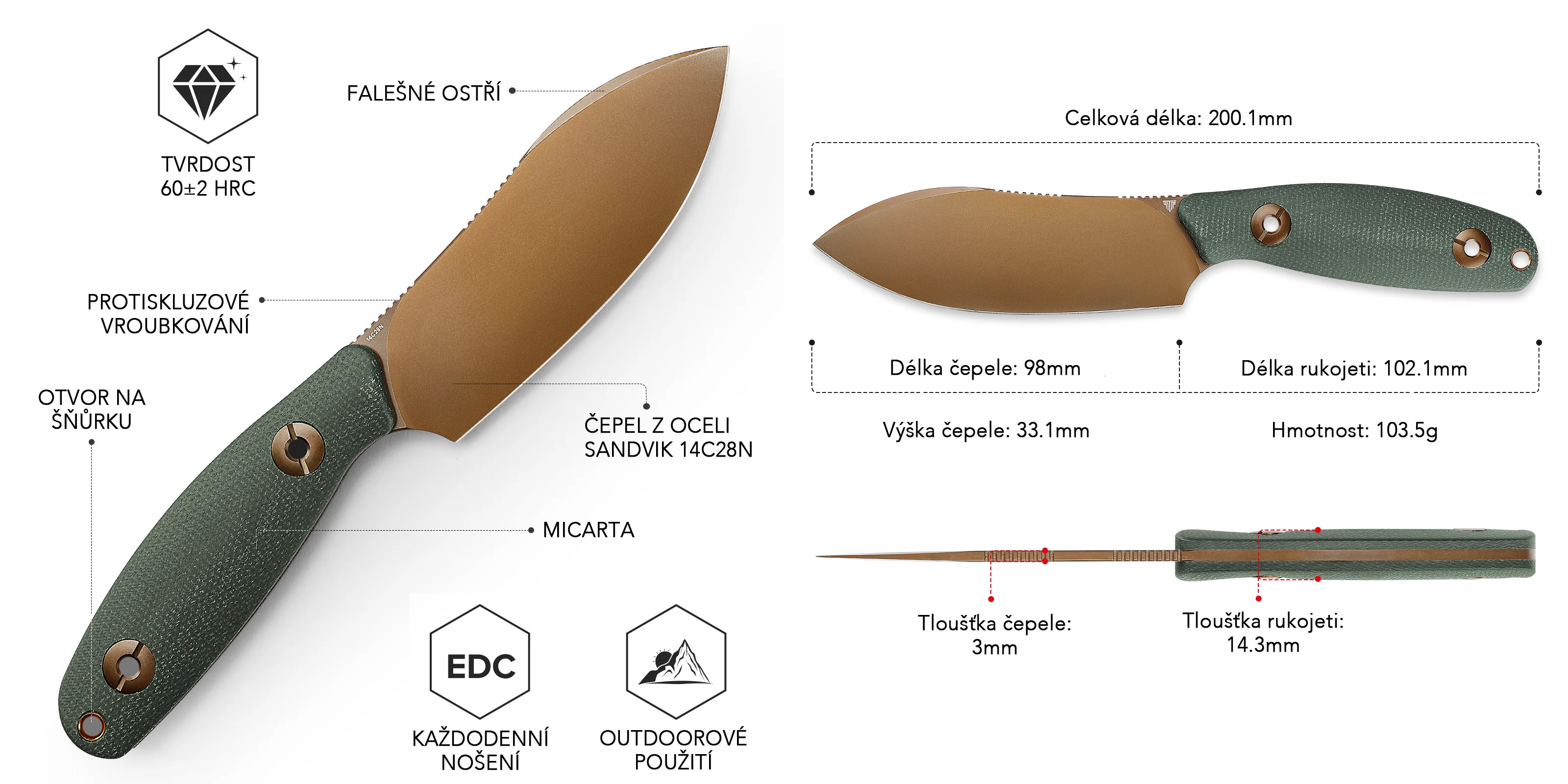 Už po prvním uchopení poznáte, že držíte v ruce kvalitu. Konstrukce full-tang zajišťuje maximální pevnost při práci a čepel z odolné oceli 14C28N zvládne každodenní zatížení bez kompromisů. Profil drop point poskytuje univerzální využití při outdoorových aktivitách i běžném použití. Ať už budete dělat cokoliv