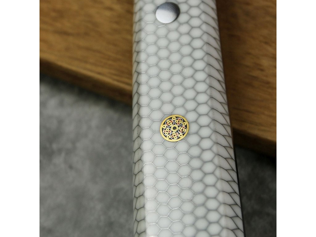 Ergonomická rukojeť z bílé medové pryskyřice perfektně padne do ruky a zabraňuje sklouznutí prstů. Použitý materiál je tvrdý a odolný. A taky nádherně vypadá. Závěrečné opracování navíc zamezuje pohlcování pachů i vlhkosti. Díky tomu všemu je rukojeť odolná a pevná. Takže něco vydrží.