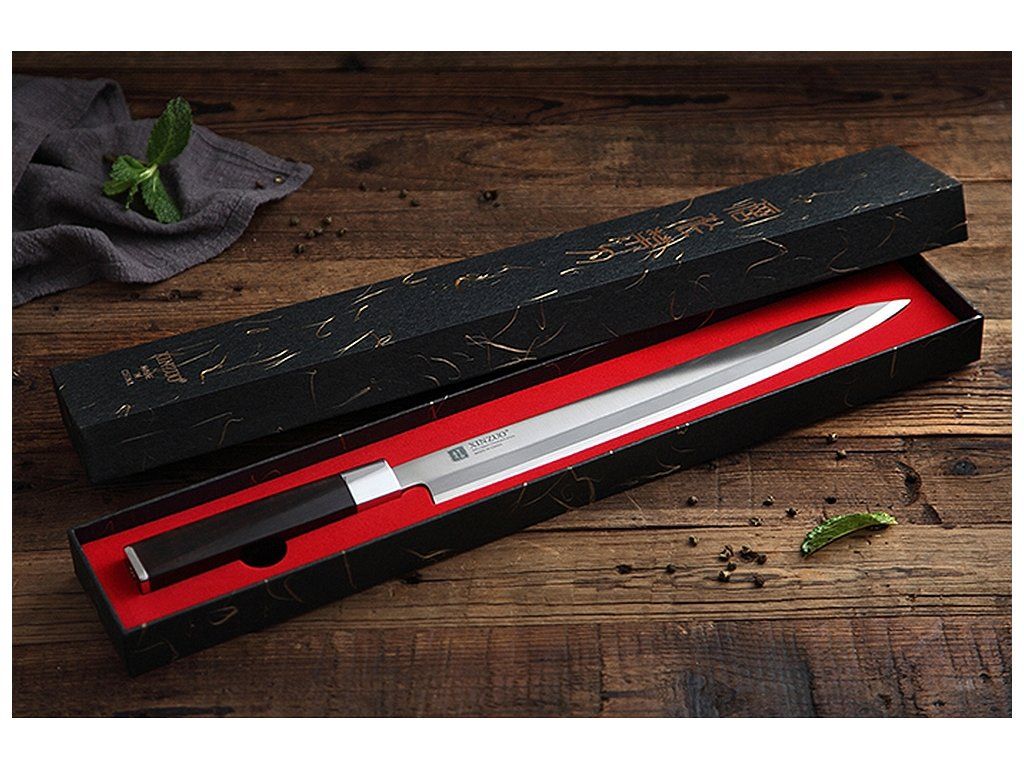 Profesionální nůž Xinzuo® Sashimi S-E si zaslouží pořádný obal. Přijde vám tak v originální dárkové krabičce. Spolu s ním dostanete i certifikát potvrzující jeho pravost a kvalitu.