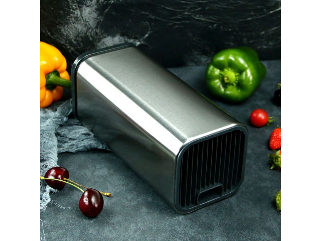 Držák je vyroben z vysoce kvalitní nerezové oceli. V kuchyni, která je neustále vystavena vodě, je to vhodný pomocník při skladování nožů. Má 14 slotů 1 extra slot pro kuchyňské nůžky. Je vhodný pro všechny druhy nožů s délkou až do 8,25".