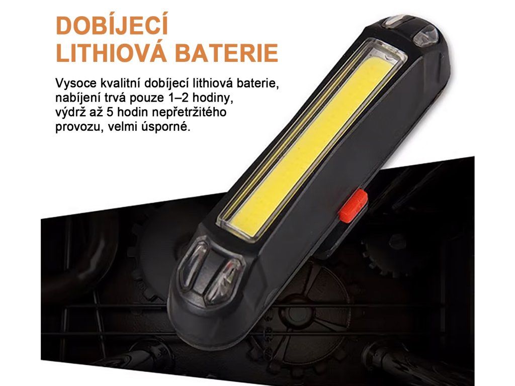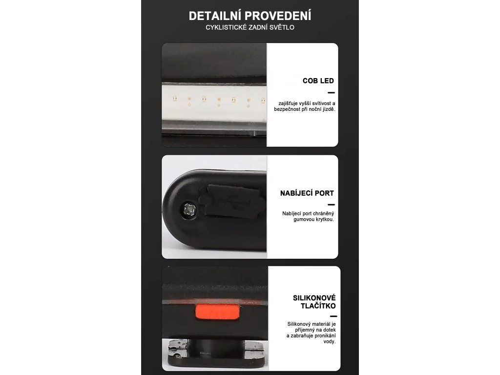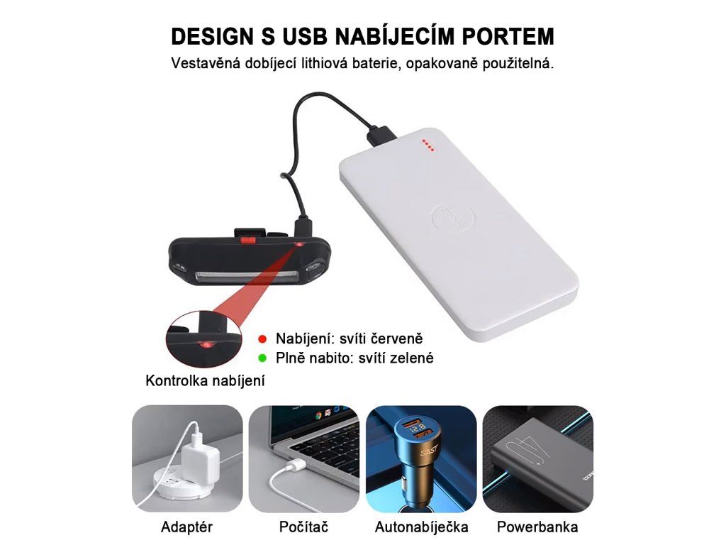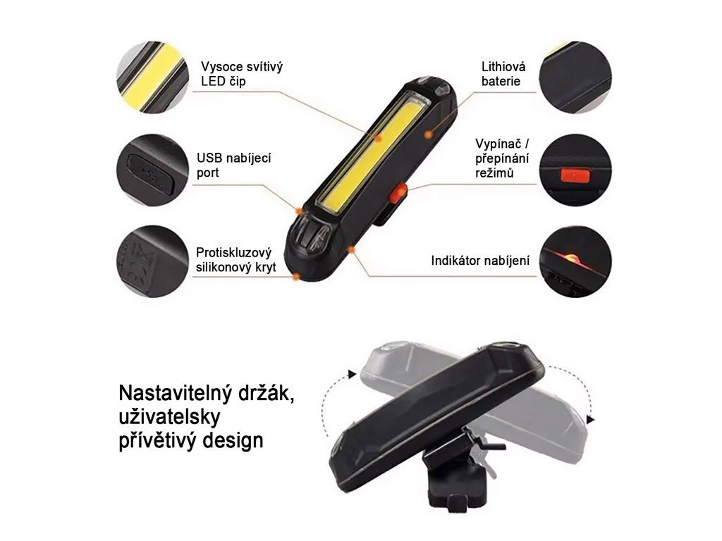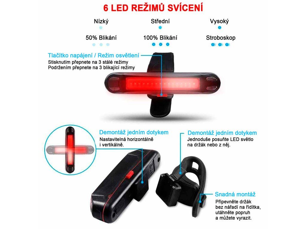 Světlo nabízí 5 režimů. Díky USB dobíjení a vestavěné 500mAh baterii se světlo plně nabije za pouhé 2 hodiny.