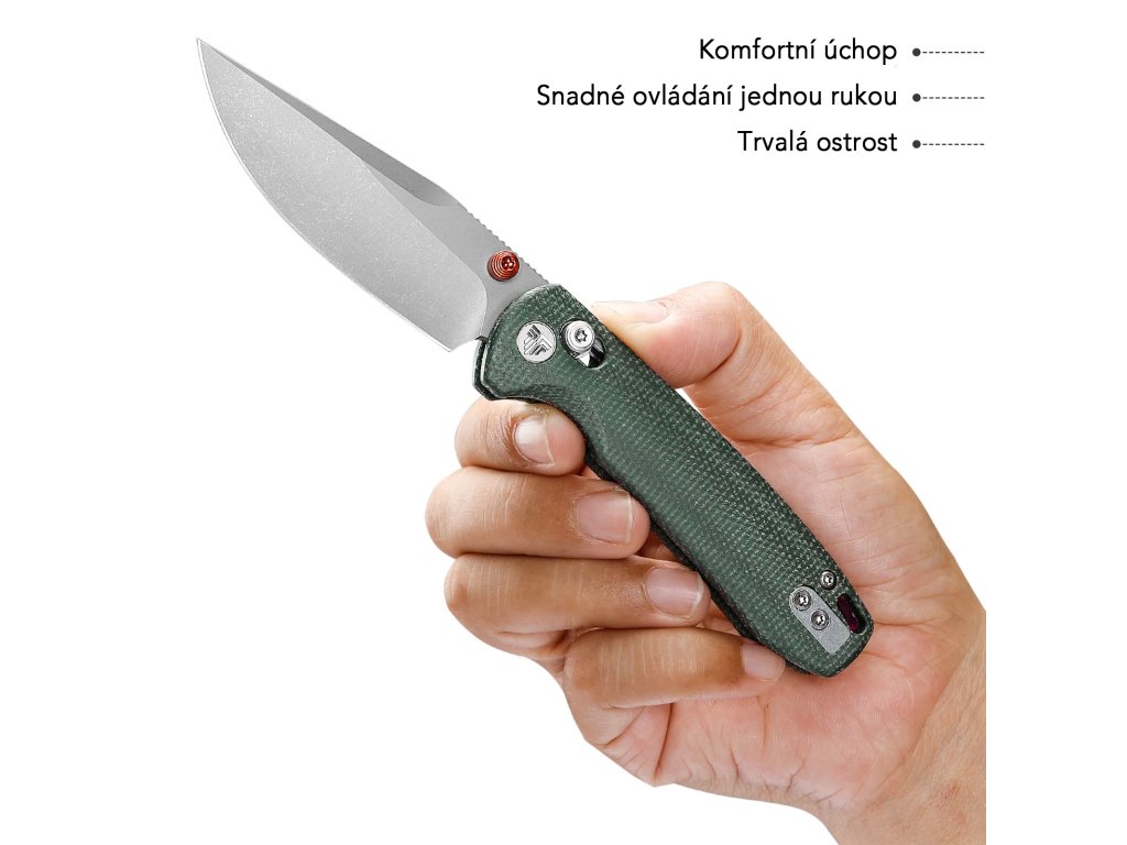 Ocel 14C28N je známá svou vyváženou kombinací odolnosti proti korozi a schopnosti dlouhodobě držet ostří. Tvrdost 60 ± 2 HRC zajišťuje spolehlivý výkon při každodenním používání. Profil clip point poskytuje přesné vedení řezu a kontrolu při běžných řezných úkolech.