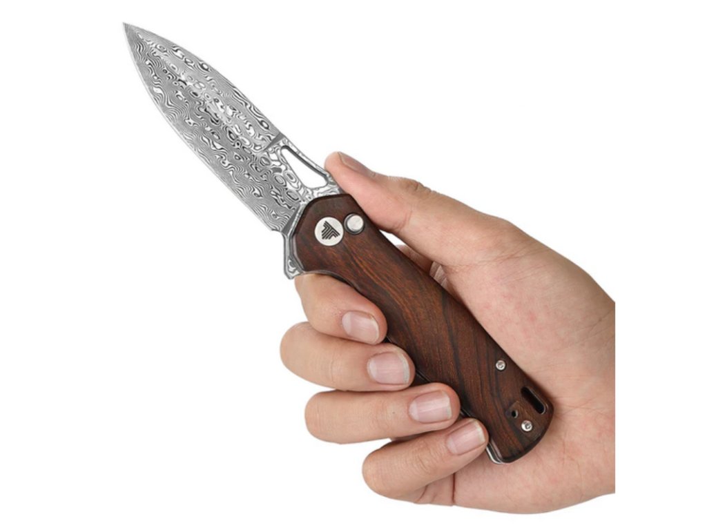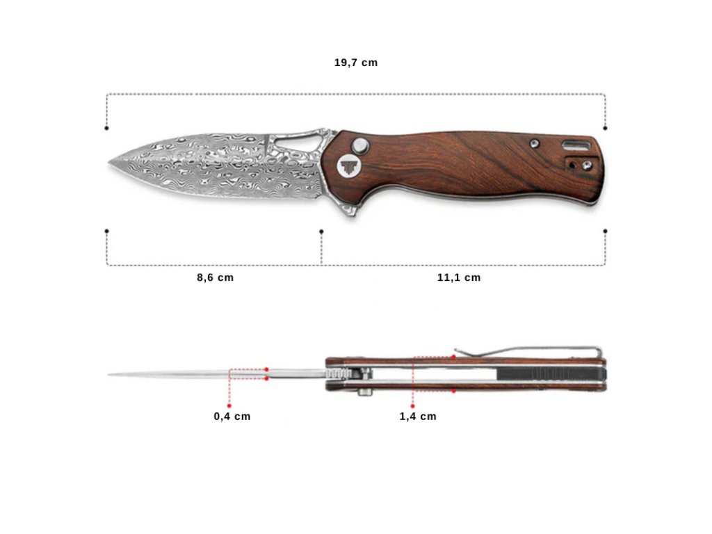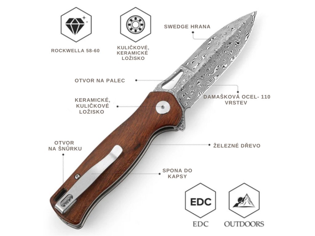 Už po prvním otevřením poznáte, že držíte v ruce kvalitu. Ručně broušená čepel ze 110 vrstev damaškové oceli nejen dobře vypadá, ale hlavně slouží. Díky kuličkovému ložisku máte jistotu, že práce se zavíracím nožem Crateris 01 bude vždycky plynulá. Pojistka button lock zase zajistí, že čepel zůstane bezpečně otevřená nebo zavřená. Ať už budete dělat cokoliv.