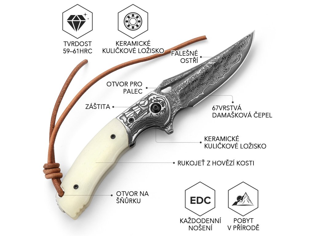 - 67vrstvá damašková ocel zajišťuje vysokou odolnost.